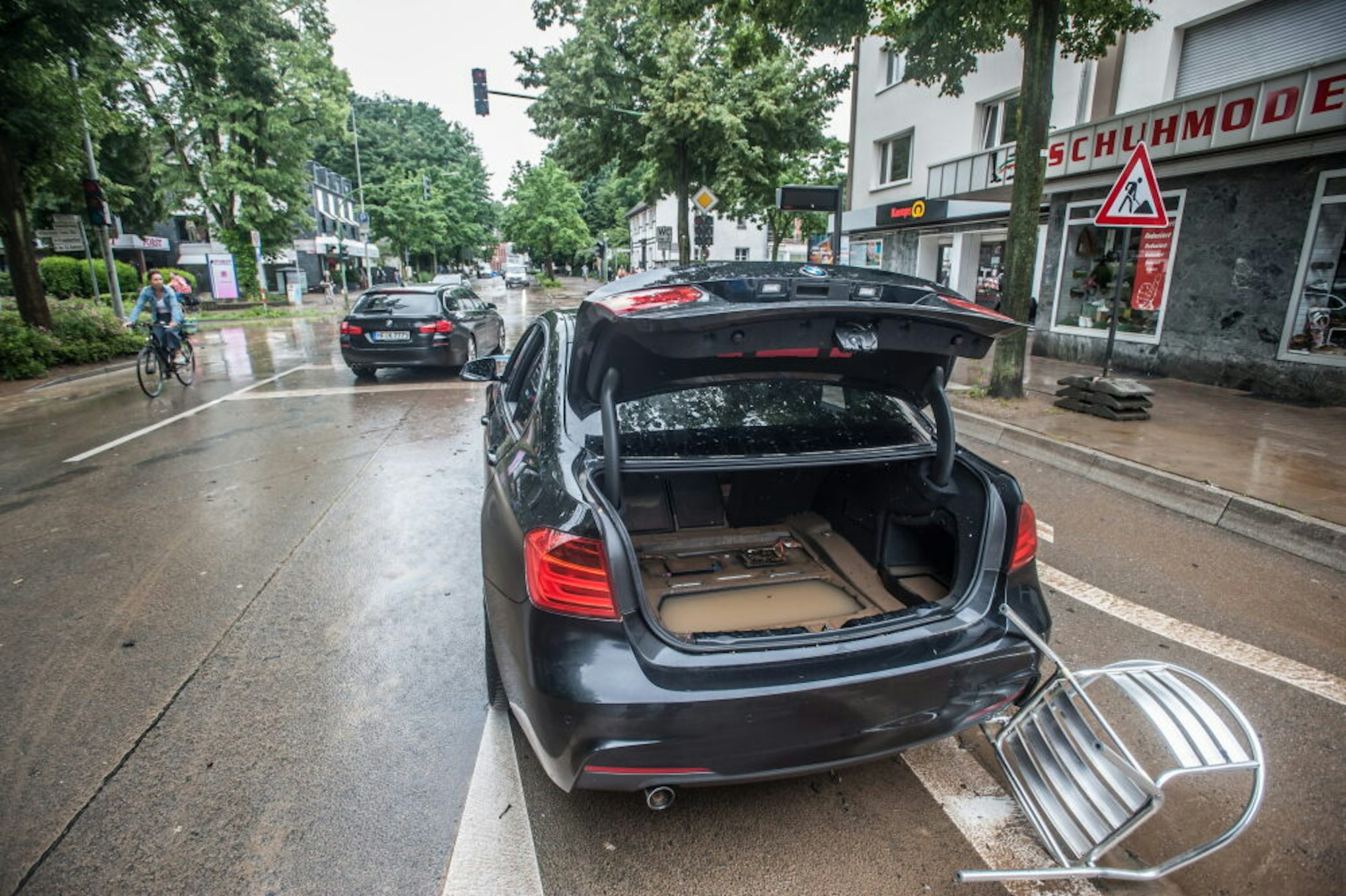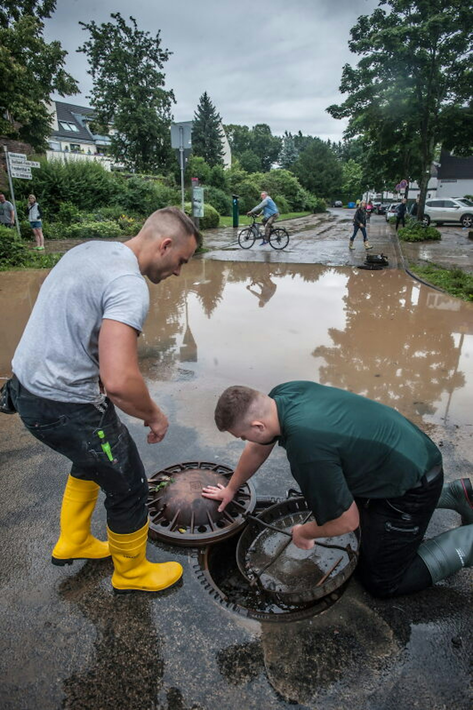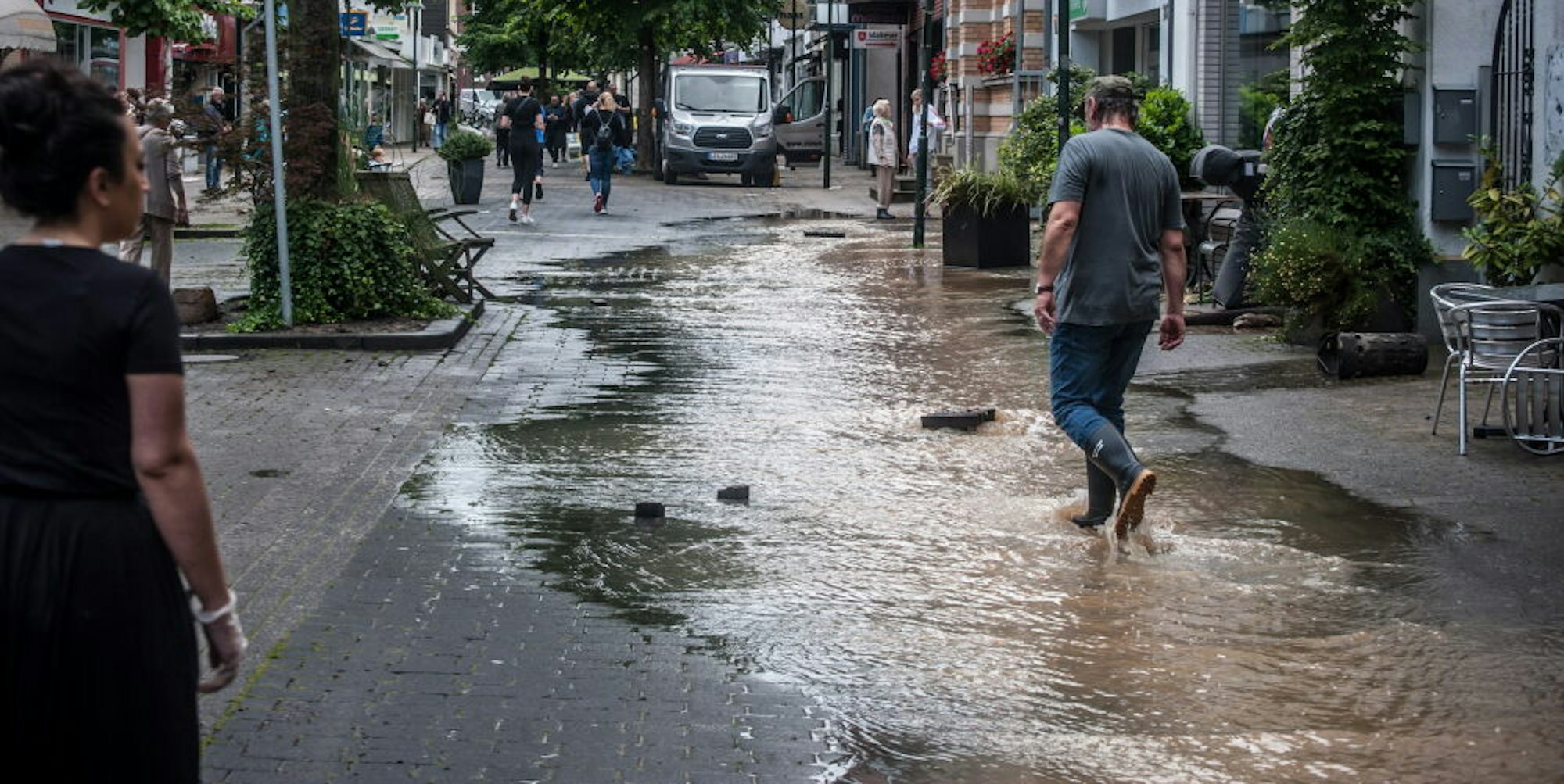 Leverkusen – Um 8.30 Uhr wird auf dem Schlebuscher Arcadenplatz der Bauernmarkt aufgebaut. Als hätte es die Regenmassen und die über alle Dämme tretende Dhünn nebenan nie gegeben, laden Händler Blumen und Salatköpfe aus den Wagen. Wer hier die Fußgängerzone betritt, denkt: Alles gut überstanden. Der Eindruck ist schon wenige Meter die Bergische Landstraße hinunter dahin. Hier schießt kurz vor dem Lindenplatz noch am Morgen ein brauner Sturzbach von der komplett unter Wasser stehenden Dechant-Fein-Straße in die Fußgängerzone. Die Ecke Oulustraße / Bergische Landstraße ist unpassierbar, zwei Autos stehen mitten in einer gigantischen Seenlandschaft.
