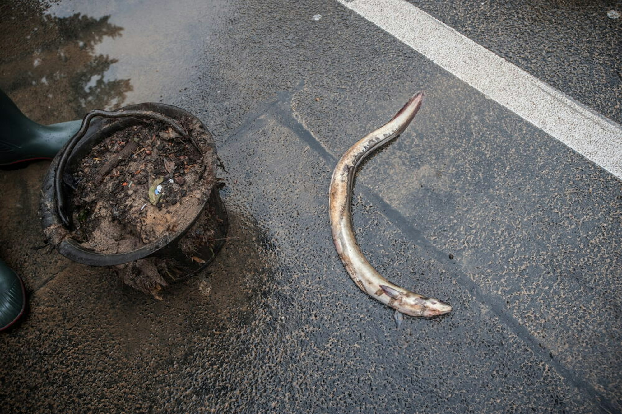Ein Aal überlebte den Ausflug in die Fußgängerzone nicht.