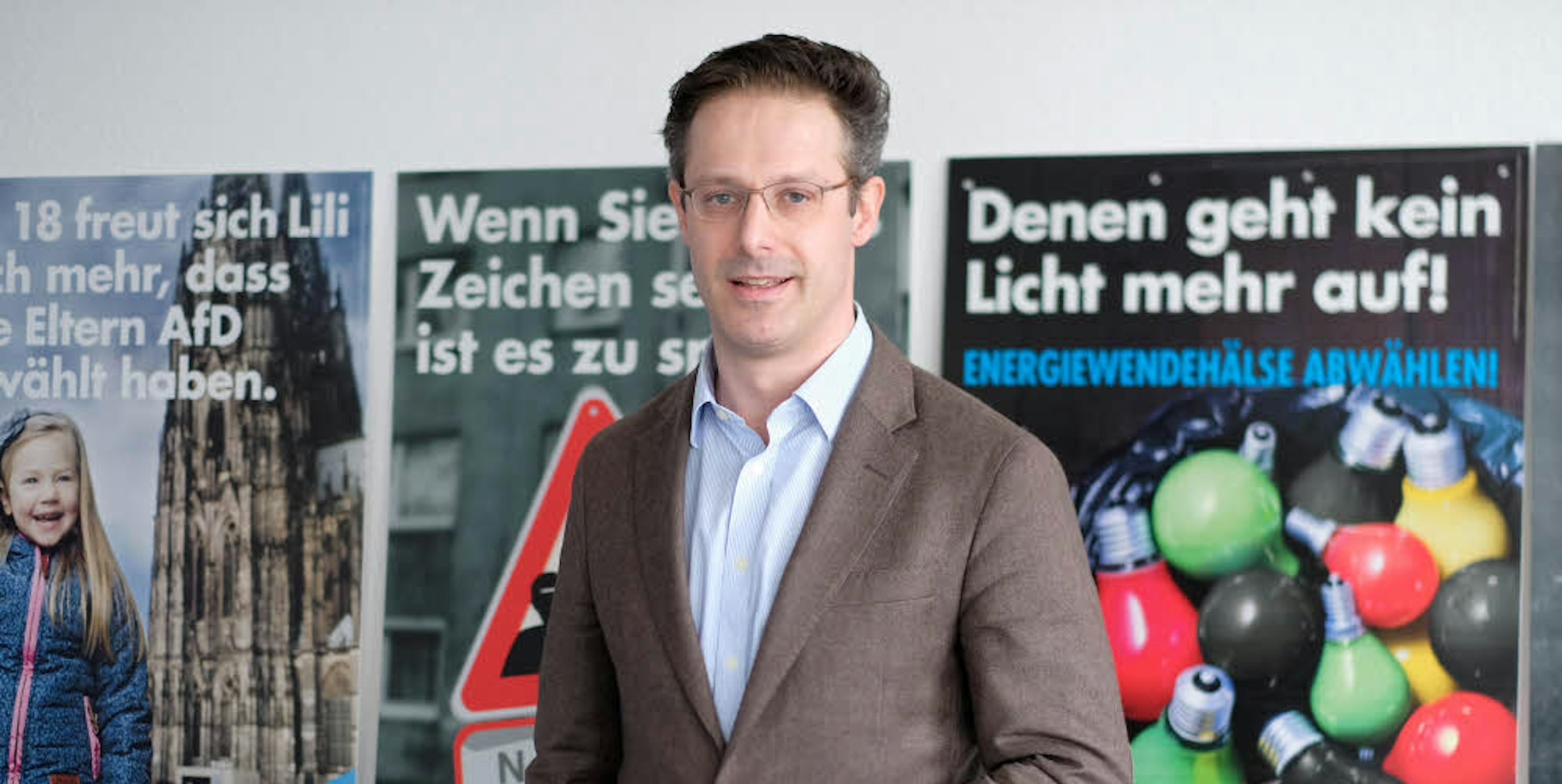 AfD-Landeschef Marcus Pretzell beim Interview-Termin vor den Wahlplakaten in der Düsseldorfer Landeszentrale.