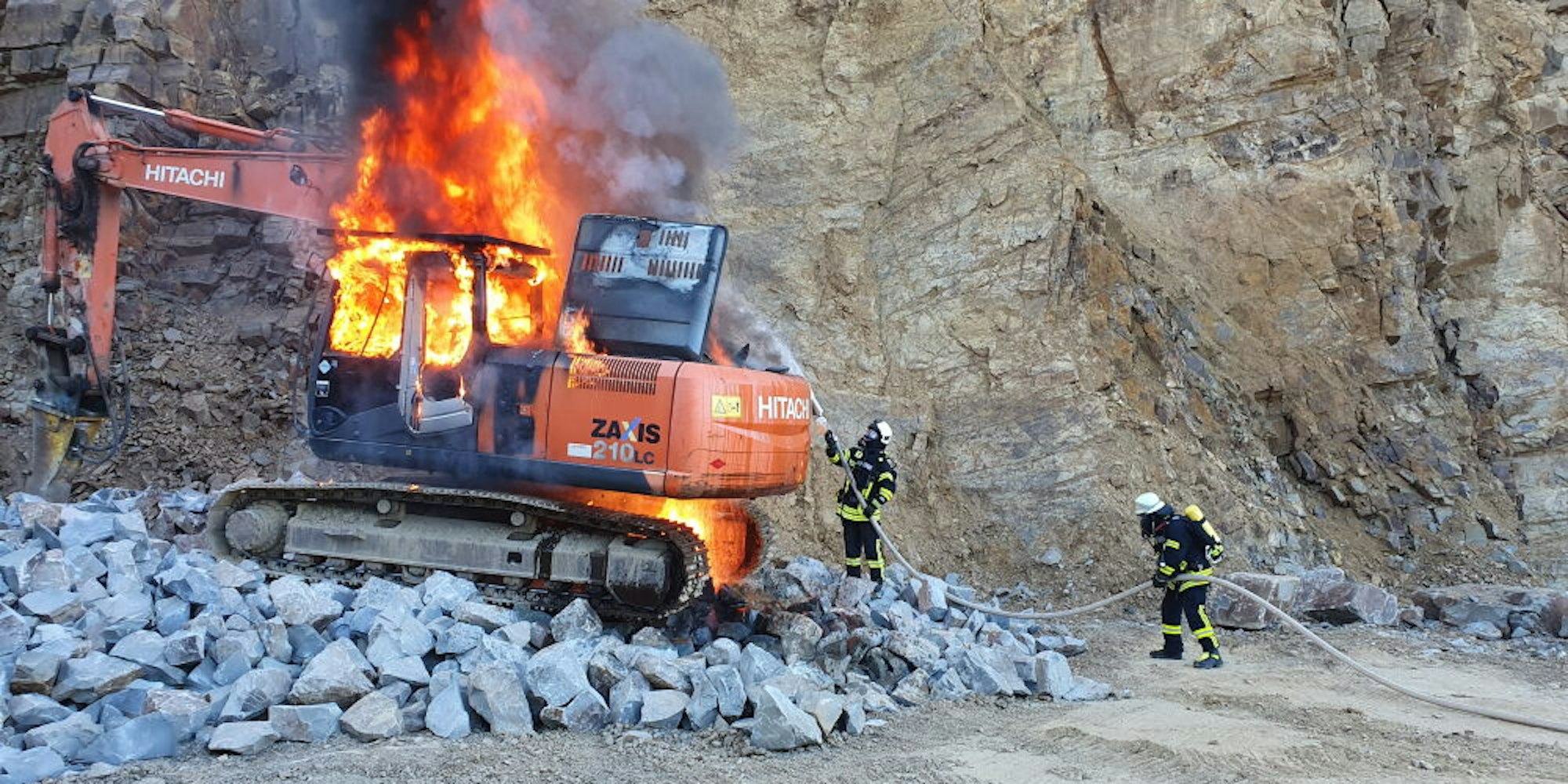 OberbreidenbachFeuerwehr löscht brennenden Bagger im Steinbruch