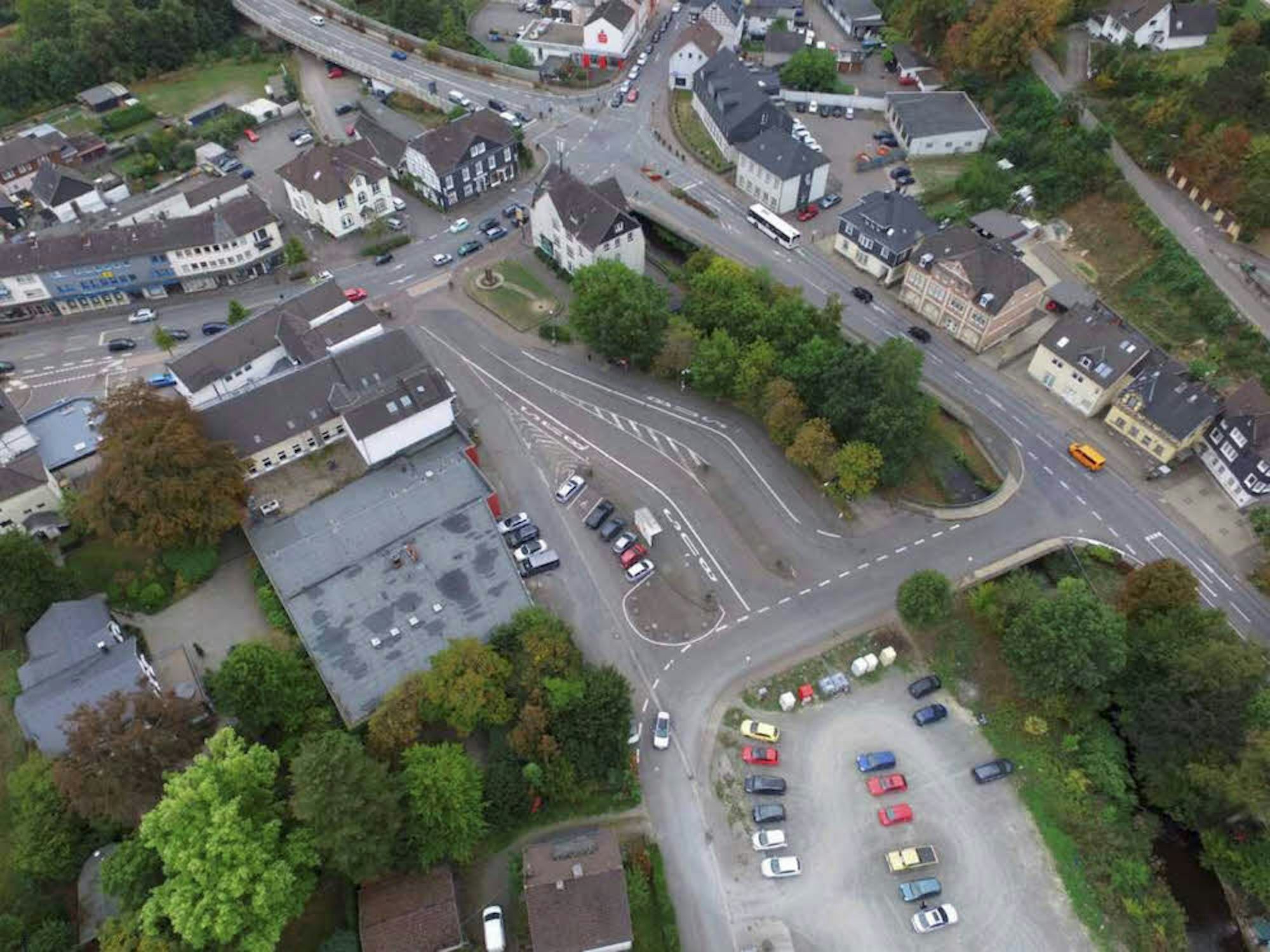 Ab Frühjahr 2019 Stauzentrum: Der neue Busbahnhof wird gebaut (M.). Wegen der Vollsperrung in Bergneustadt wird sich aus und in Richtung Autobahn (l.o.) der Umleitungsverkehr durch Derschlag quälen. Schon jetzt ist die Derschlager Hauptkreuzung zu Stoßzeiten ein Nadelöhr. Und die Arbeiten an der Klosterstraße (r.) werden auch erst Ende 2019 abgeschlossen sein.