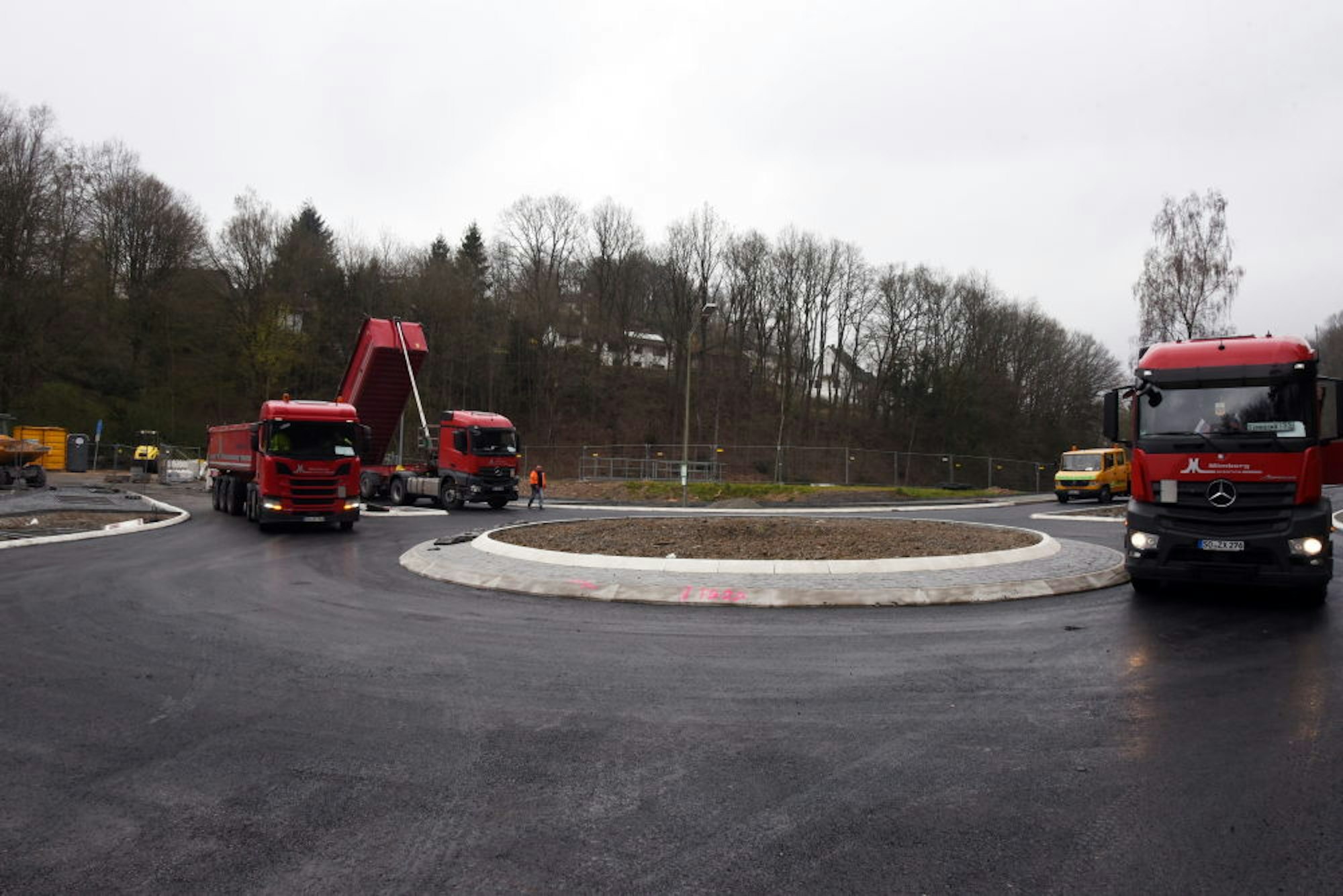 Der Kreisverkehr am Schulzentrum ist fertig, die Asphaltierung schreitet voran.