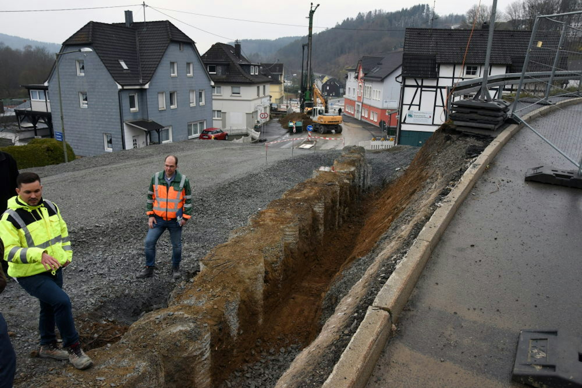 Dieses Verfahren sei weitaus schonender für die nahe Bebauung als Tiefbautechniken, bei denen viel Erde abgegraben oder die Stützelemente unter großer Erschütterung in den Boden getrieben werden, erklärt Matthias Bergmann, der für den Landesbetrieb Straßenbau die Aufsicht führt. So ist Säule neben Säule entstanden. Als nächstes wird von der Hangseite aus eine Betonschale angebracht und schließlich alles mit Bruchstein ansehnlich verkleidet. Ende Juni könnte die Straße schon wieder freigegeben werden.