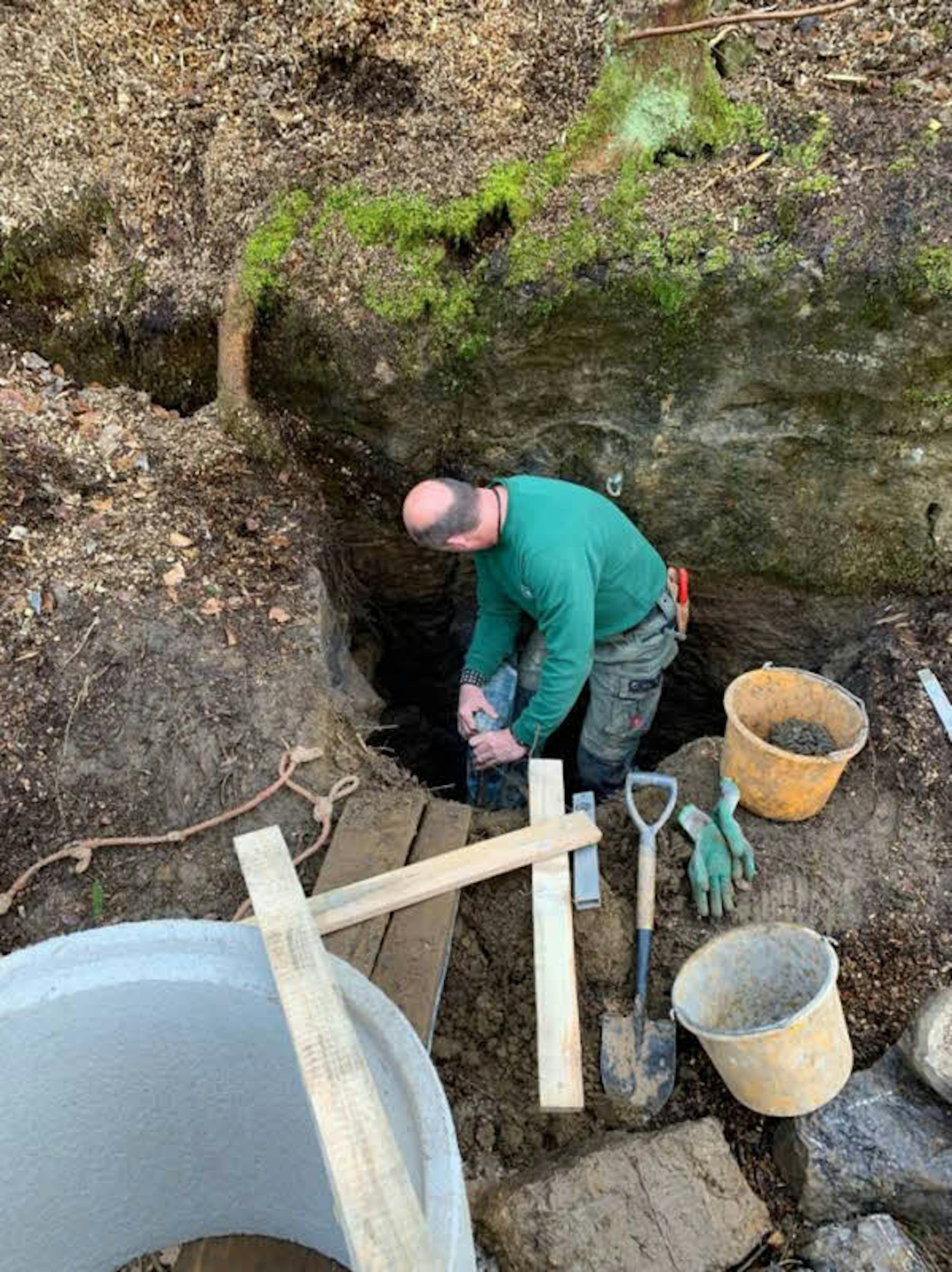 Und Bürgermeister Dr. Karthaus erinnert an länger zurück liegende Untersuchungen am plätschernden Walbach, dessen Verlauf man mit gefärbtem Wasser auf die Spur kommen wollte, weil er an mehreren Stellen einfach im Boden verschwindet. Karthaus: „Wir wussten: Der Mühlenberg muss löchrig sein.“ Zumal beim Erschließen des benachbarten Baugebietes entlang der heutigen Herderstraße mehrere Spalten in der Böschung sichtbar wurden.