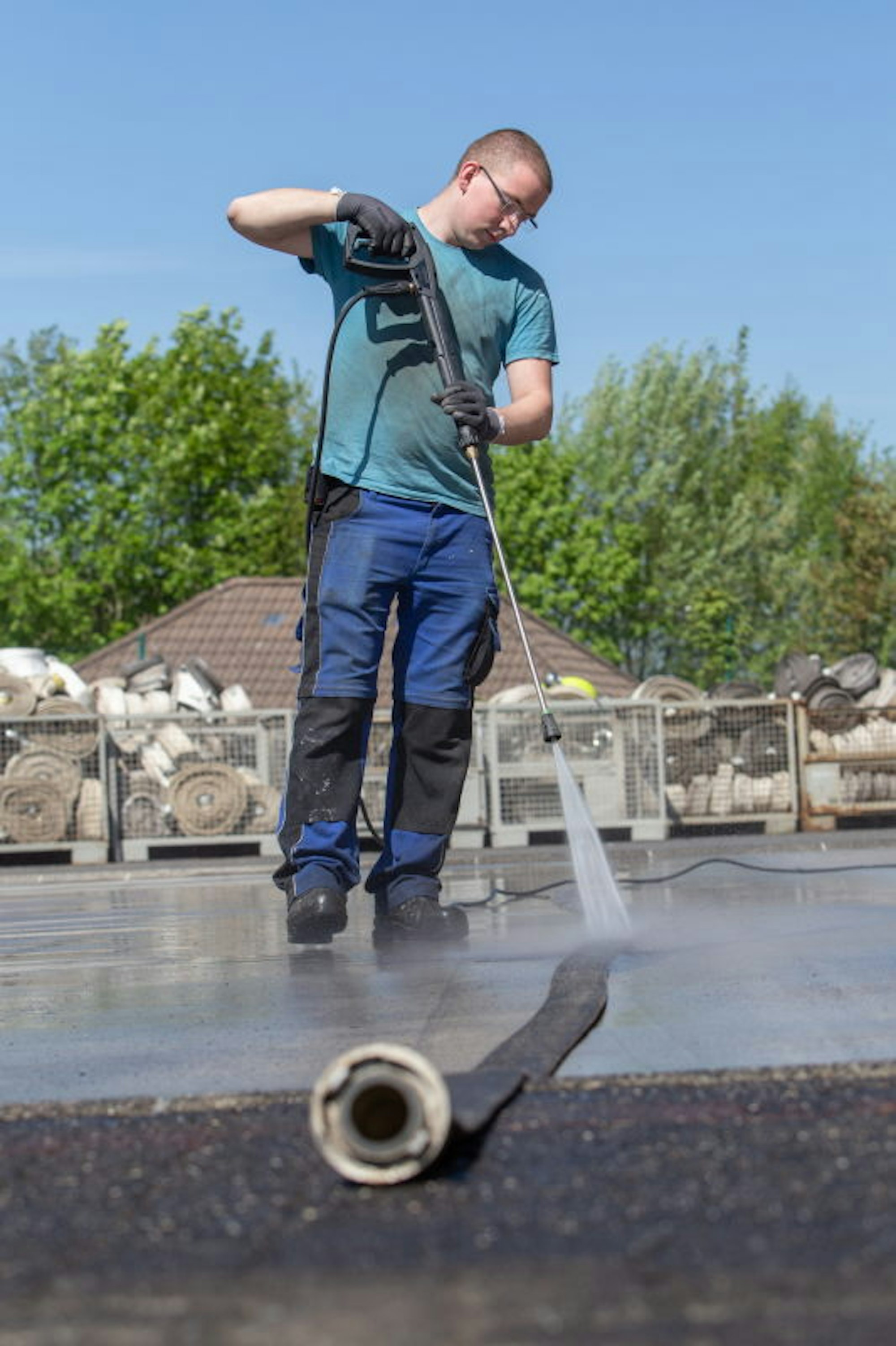 Benjamin John reinigt die verrußten Schläuche mit dem Dampfstrahler vor.