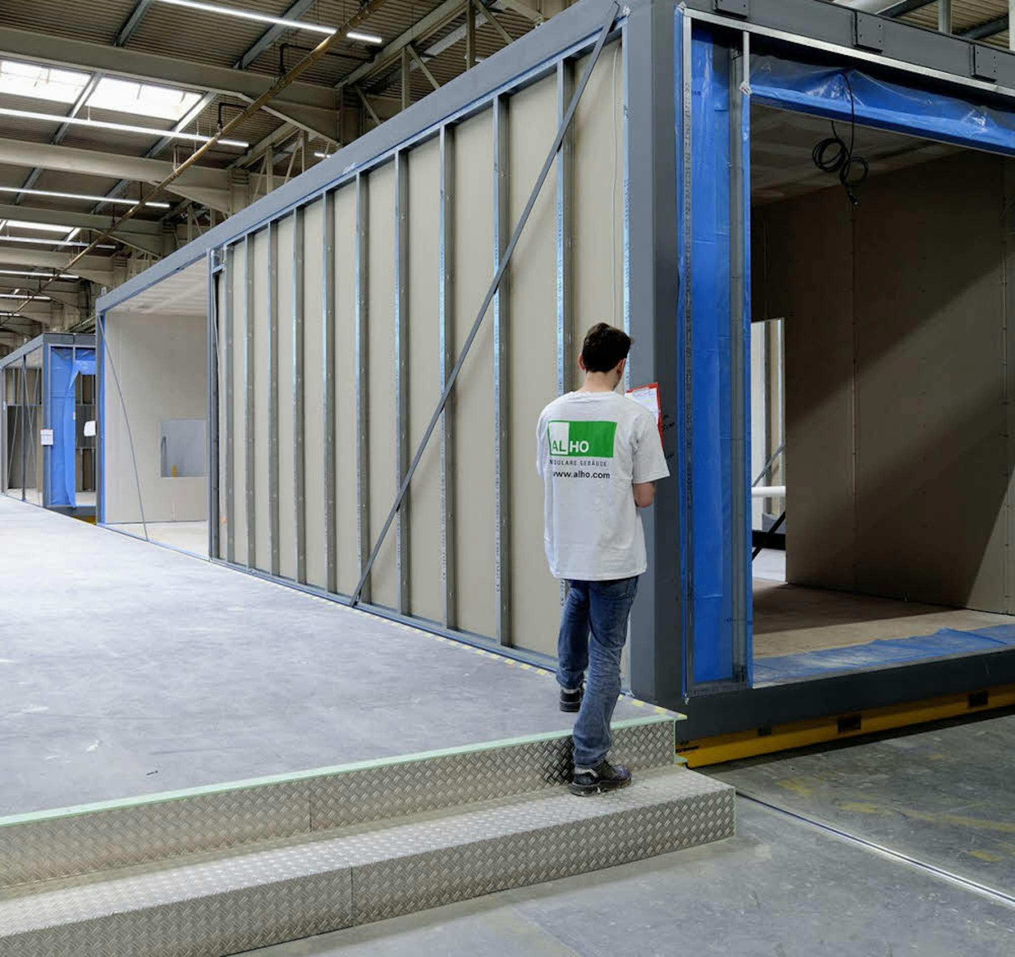 Produziert werden die 72 Agewis-Module in der „Raumfabrik“, einer 500 Meter langen Halle auf dem Alho-Gelände in der Gemeinde Friesenhagen bei Morsbach, nur einen Steinwurf hinter der Grenze Oberbergs zu Rheinland-Pfalz. Knapp die Hälfte der 1100-köpfigen Alho-Belegschaft in Deutschland und Europa arbeitet hier. Ein Besuch dort macht deutlich, was mit industrieller Bauweise gemeint ist: In der Schlosserei wird das Stahlskelett des Moduls zusammengeschweißt, Treppenhäuser und Aufzugschächte werden ausgespart.
