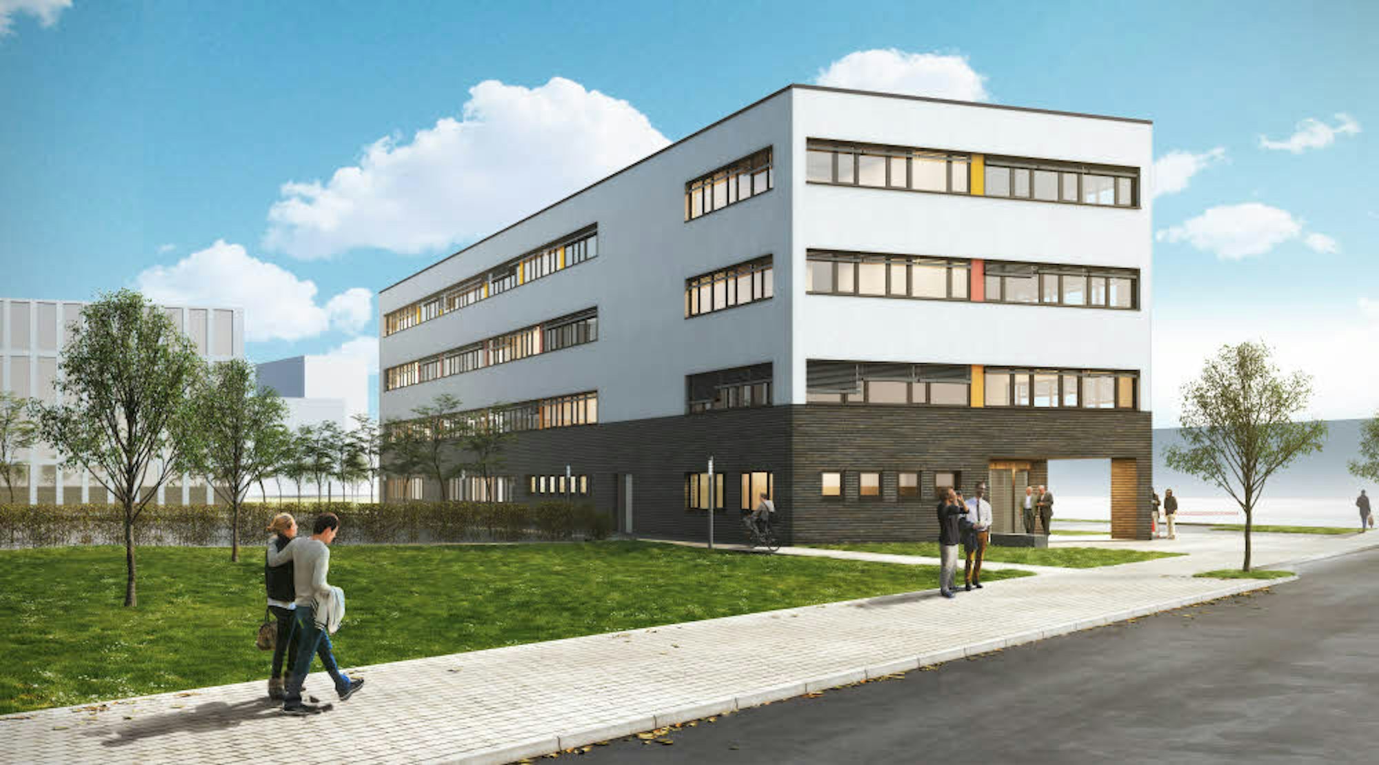 Den Zuschlag für den Bau bekam die Firma Alho, die sich seit 50 Jahren auf den Bau von Verwaltungsgebäuden, Schulen, Krankenhäusern und Wohnanlagen in Modulbauweise spezialisiert hat. Wer dahinter noch die Schulbaracken seiner Jugendtage oder die Stahlblechcontainer vermutet, wie sie auf Großbaustellen übereinandergestapelt als Büros und Materiallager dienen, irrt. Den Modulgebäuden ist ihre industrielle Bauweise nicht anzusehen – weder von innen noch von außen.