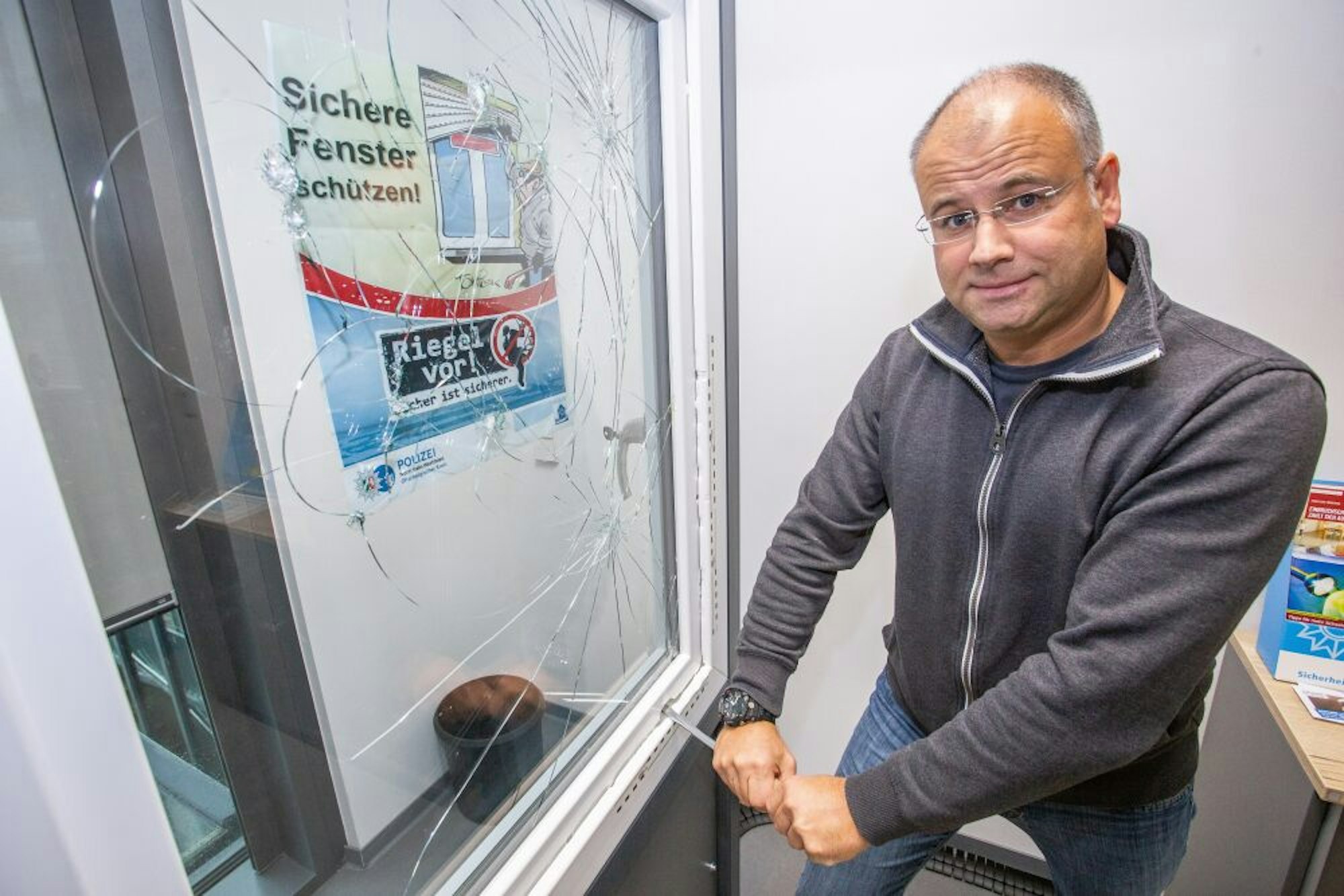 In der polizeilichen Beratungsstelle zeigt der Kommissar, wie einfach ein herkömmliches Fenster zu knacken ist.