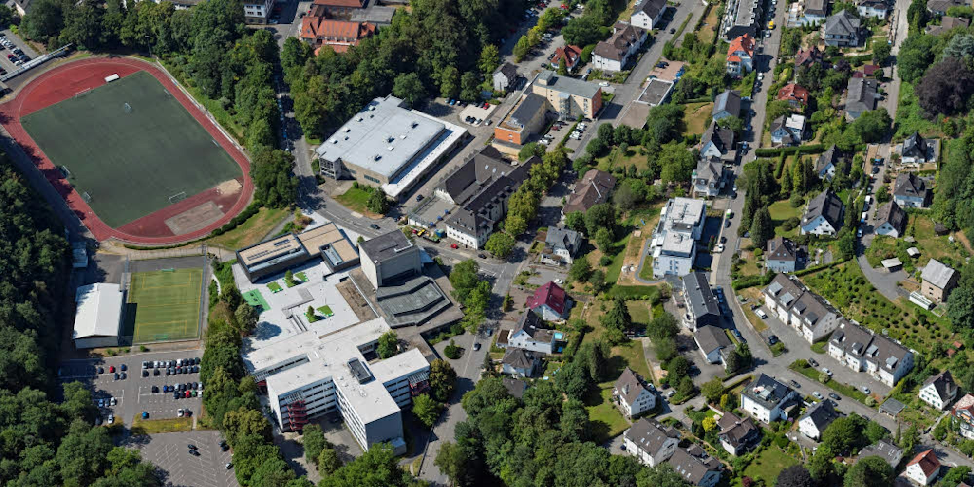 Das Lindengymnasium, unten im Bild der Standort Grotenbach, entstand durch eine Fusion von Gymnasium Moltkestraße und Grotenbach-Gymnasium. Es ging so erstmals im Schuljahr 2014/15 an den Start.