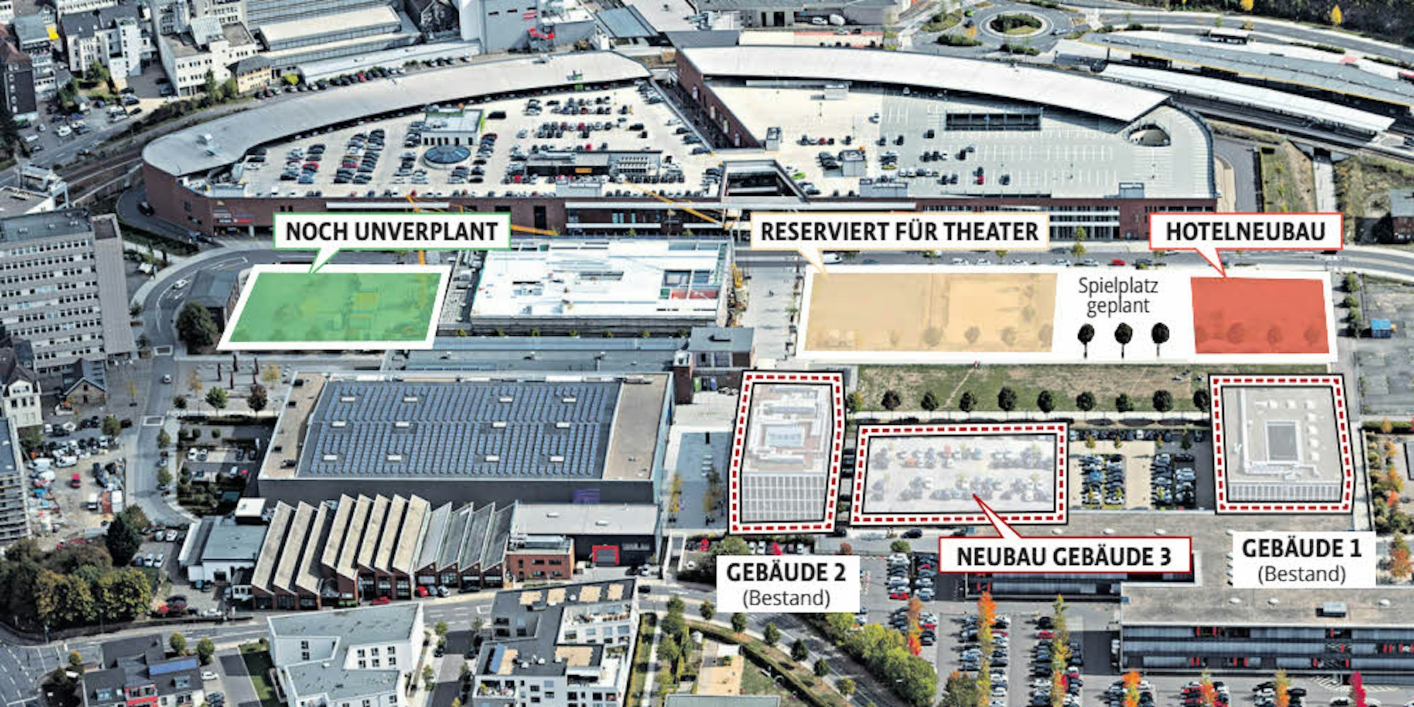 Zurzeit hat die Firma von Frank Ferchau zwei Gebäude auf dem Steinmüllergelände. Das dritte befindet sich im Bau. Ein viertes Ferchau-Gebäude könnte auf der grün unterlegten Fläche zwischen Steinmüller-Hochhaus und Kinocenter entstehen.