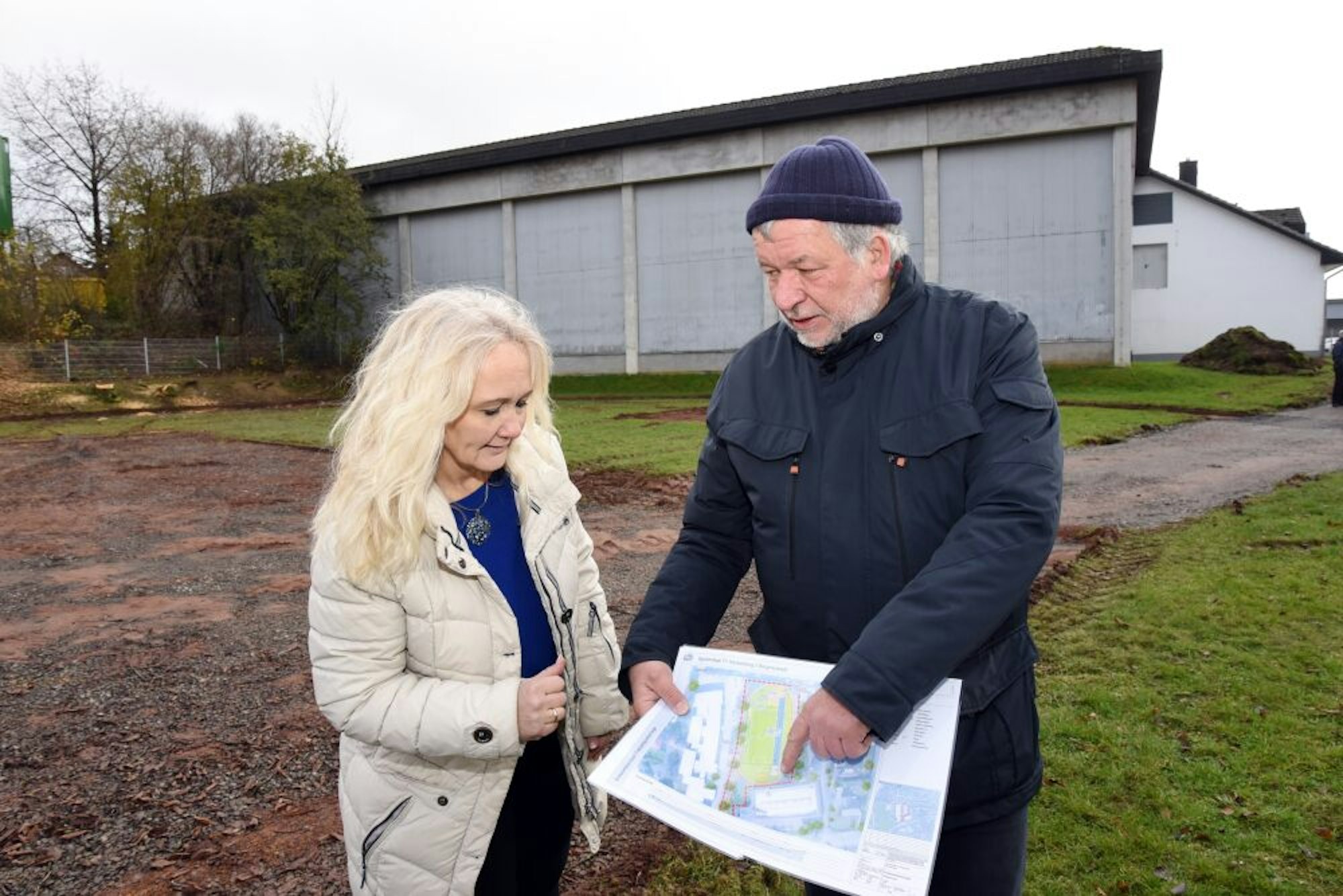 Schulleiterin Alexandra Stahl-Hochard und Vereinsvorsitzender Michael Zwinge mit dem Sanierungsplan.