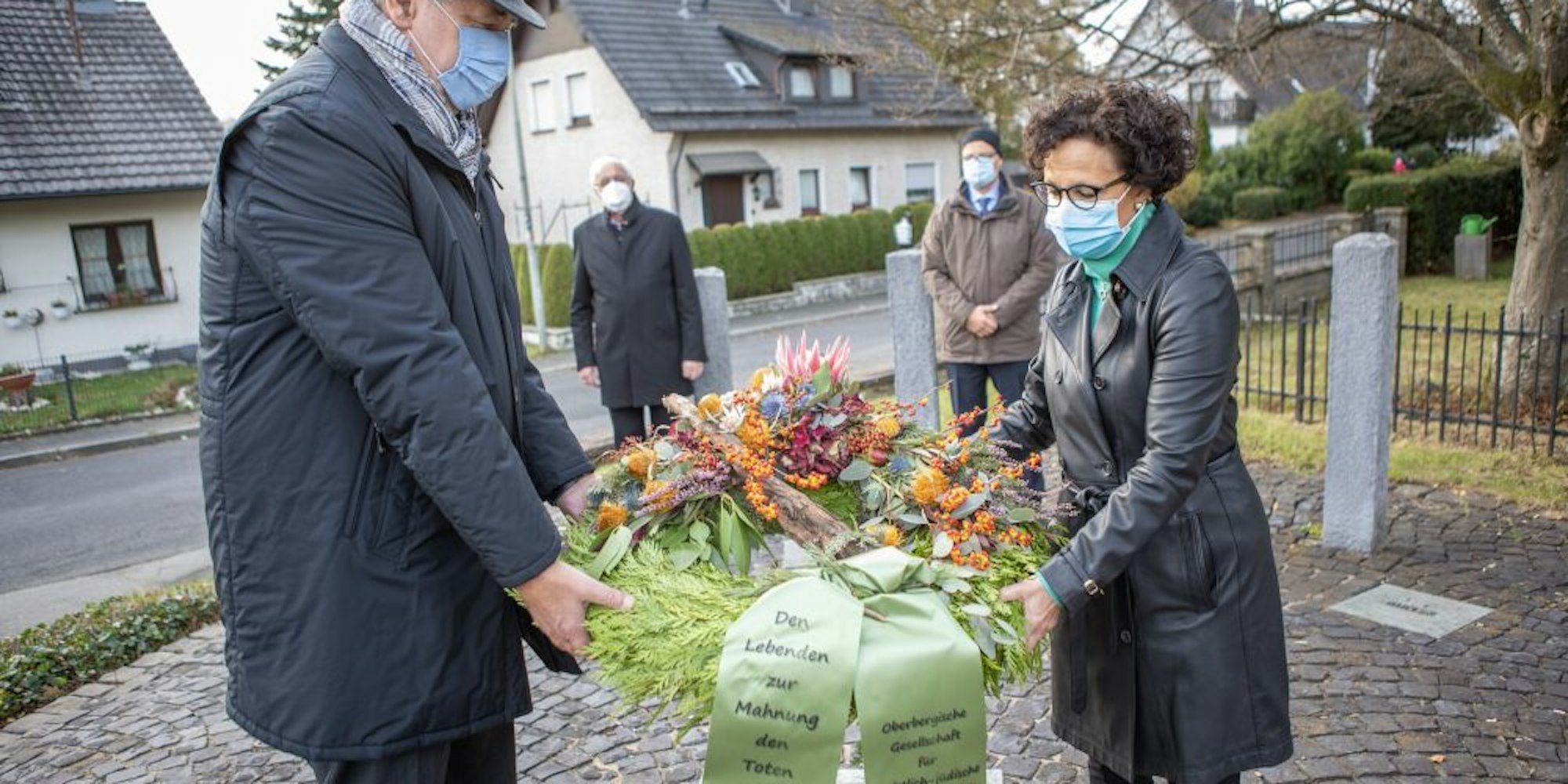 Zum 82. Mal jährt sich am Montag die Reichspogromnacht des 9. November 1938, doch gibt es diesmal kein öffentliches Gedenken am jüdischen Friedhof in Nümbrecht. Doch auf ein Innehalten, eben ein Zeichen, wollten weder der Freundeskreis Nümbrecht/Mateh Yehuda, noch der Freundeskreis Wiehl/Jokneam, die Oberbergische Gesellschaft für christlich-jüdische Zusammenarbeit (CJZ) und die Gemeinde Nümbrecht verzichten: In aller Stille haben die Vorsitzenden der Freundeskreise, Marion Reinecke und Dr. Roland Adelmann, CJZ-Vorsitzender Wolfgang Birkholz und Nümbrechts Bürgermeister Hilko Redenius am Sonntagnachmittag einen Kranz an der Gedenkstätte niedergelegt.