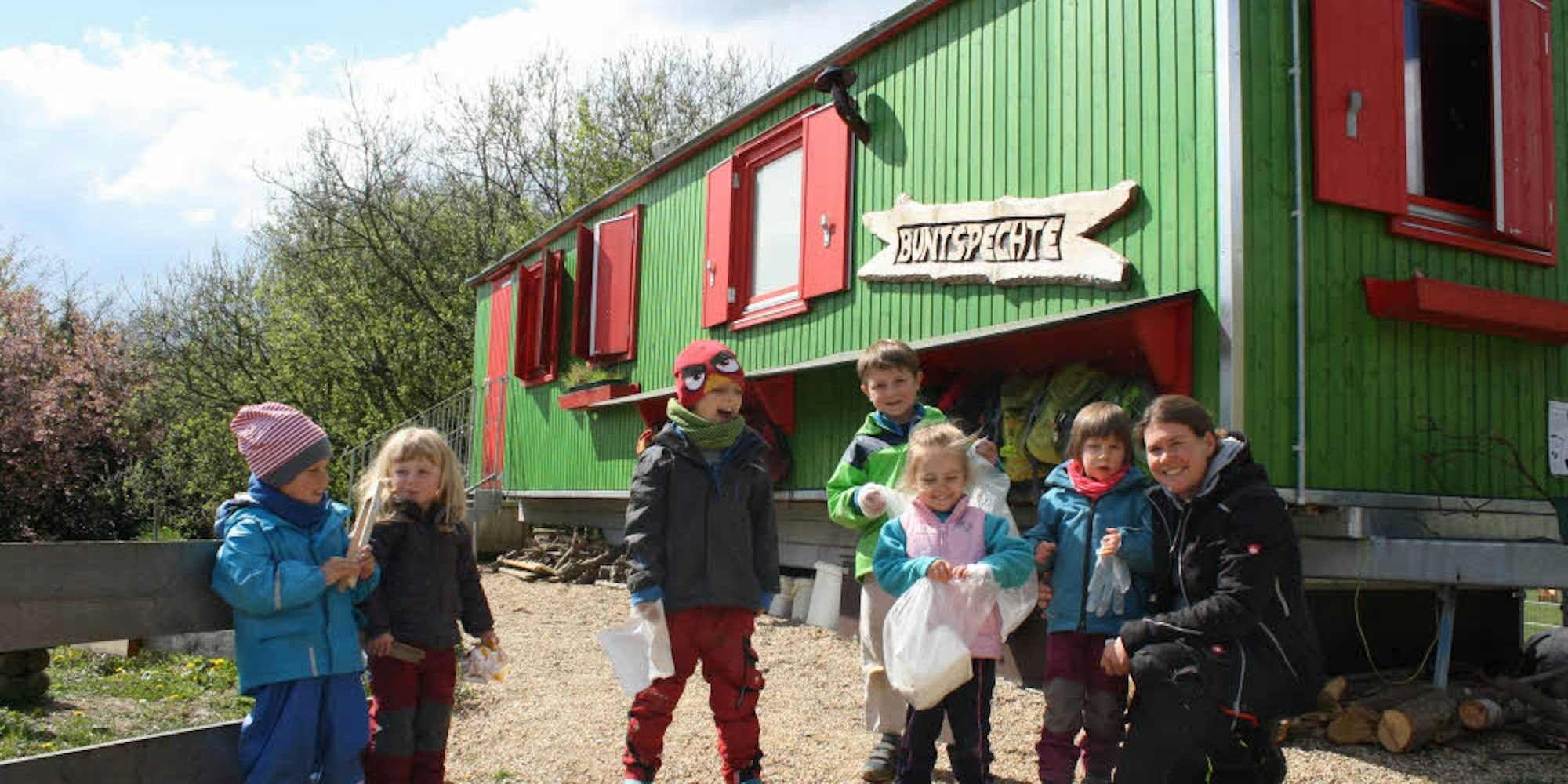 Die Kinder der Domino-Waldgruppe vor ihrem Bauwagen, das Foto entstand bei der Müllsammel-Aktion im April 2017.