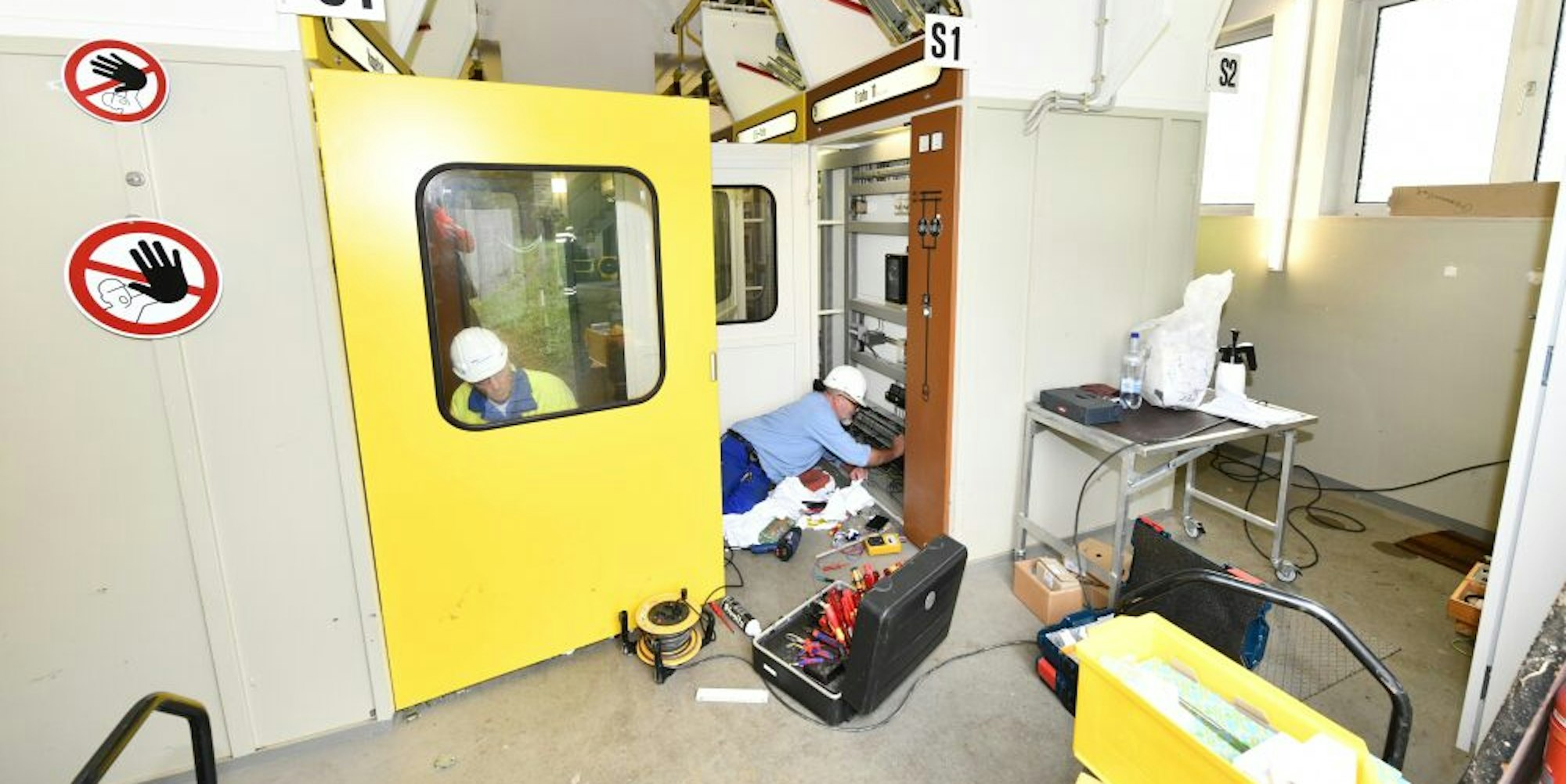 Im Transformatorhaus sind Techniker mit den Reparaturen beschäftigt.