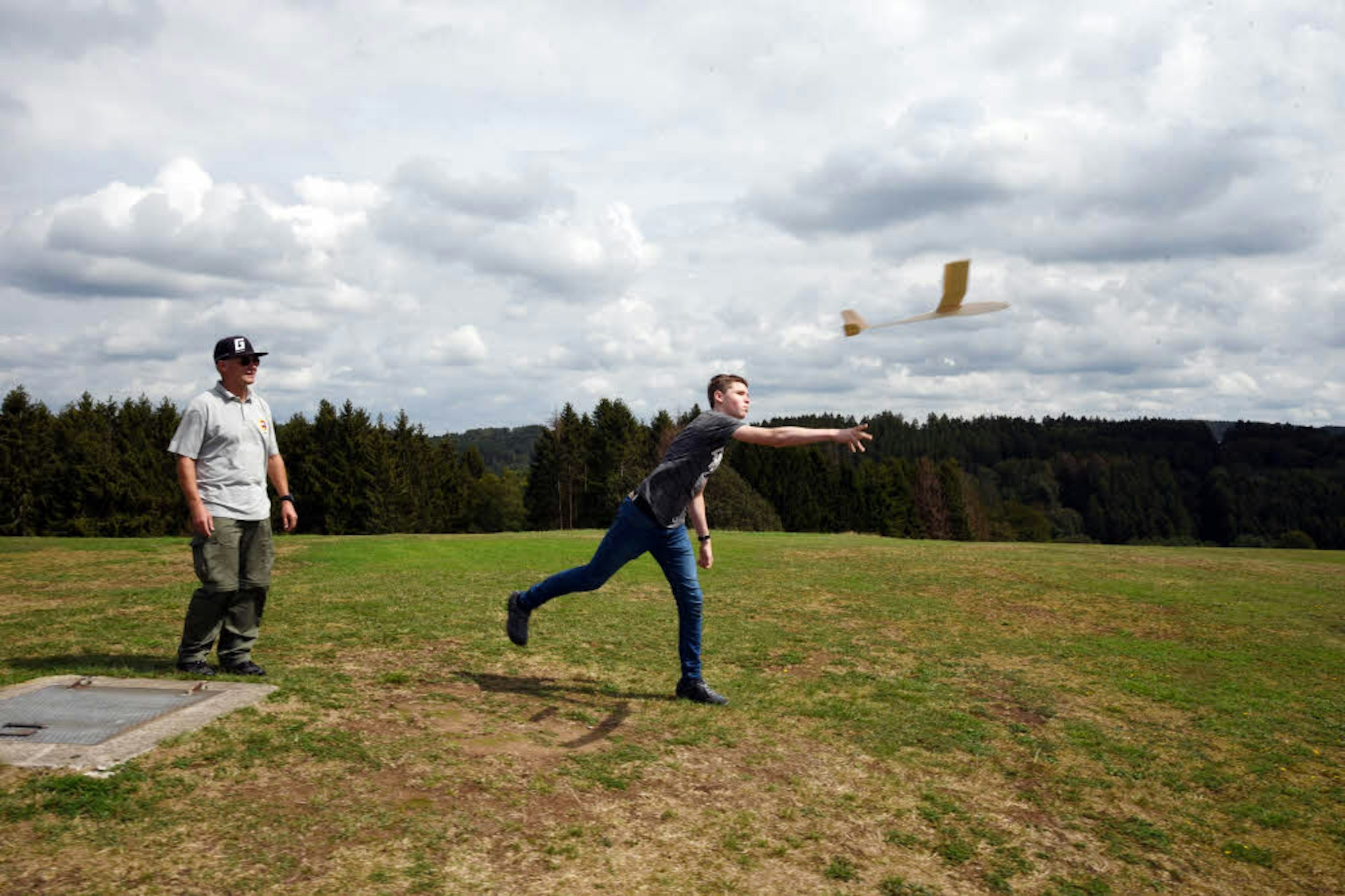 Einen Tag später, bei trockenem aber etwas windigem Wetter geht es mit den Fliegern auf den Modellflugplatz des RCF in Marienheide. Bei einer tollen Sicht auf den Ort Däinghausen probieren die vier Jungs aus, wie sie ihre Modelle möglichst lange fliegen lassen. Fred Grunow und Kai Oberlinger teilen ihr Expertenwissen mit Jan, Max, Ville und Neal. „Den Flieger am Schwerpunkt halten, ein, zwei Schritte nach vorne gehen und dann etwas nach unten geneigt gleiten lassen“, erklärt Grunow die beste Vorgehensweise für den Start. Gesagt, getan.