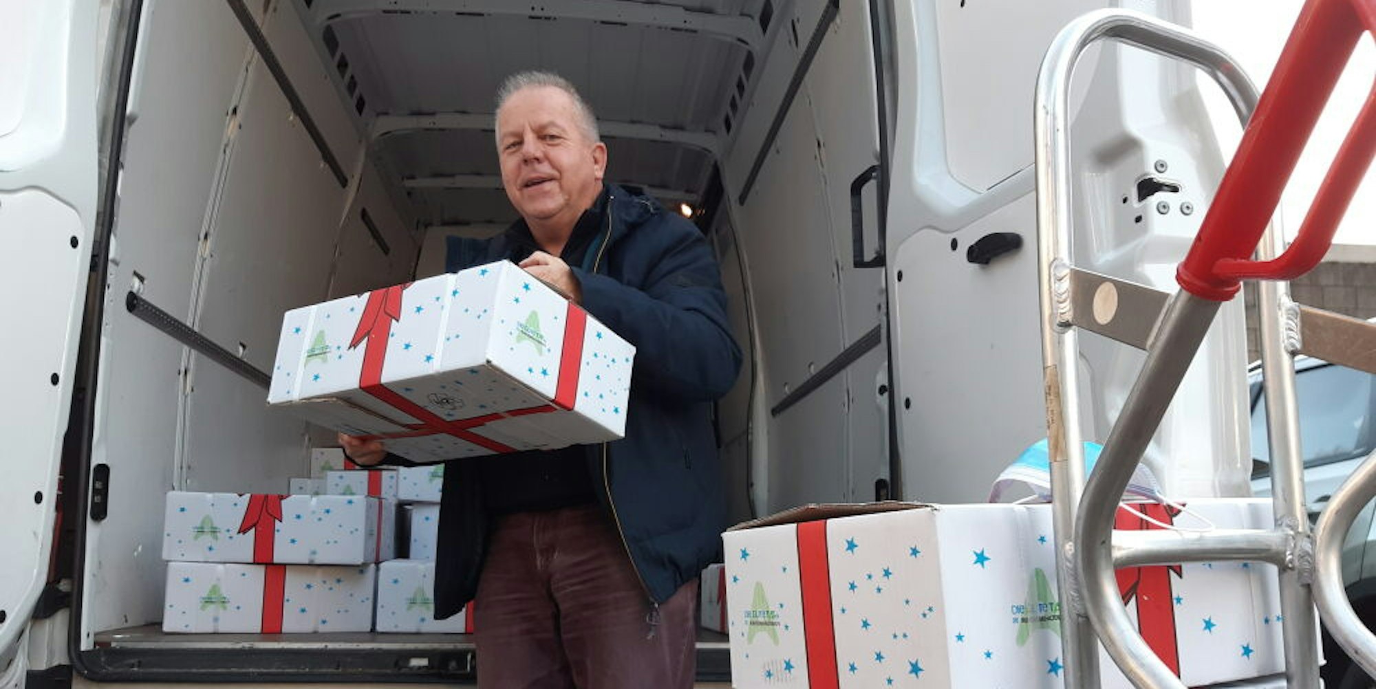 Den Tag, an dem er die Pakete aus Porz abholt, hat er seit langem vorbereitet. Am Vortag hat er einen Sprinter gemietet. Für Oberberg sind 135 Pakte vorgesehen. „Die passen nicht in mein Privatauto.“ Seine Tour quer durch den Kreis will er um 15.30 Uhr geschafft haben, wenn alles klappt. Die Verteilung an die Empfänger übernehmen elf Kirchengemeinden, die er am selben Tag anfährt.