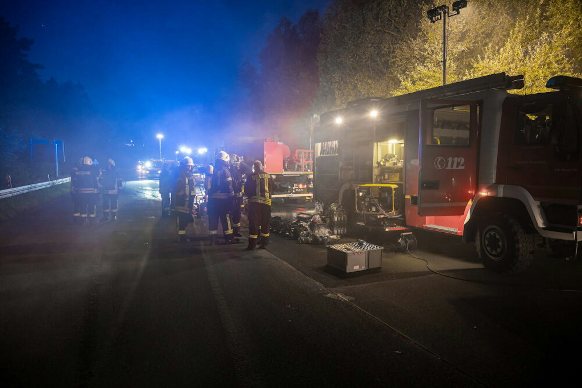Sorge bereitete dem Gummersbacher Feuerwehrchef, dass das Feuer inzwischen auch den mit Bäumen bewachsenen Hang zwischen Remondis-Gelände und Westtangente erreicht hatte: „Auf einer Länge von 100 bis 200 Metern brennt es dort im Unterholz. Das müssen wir nun in den Griff bekommen“, so Hayer. Auf alle Fälle sollte verhindert werden, dass die Flammen vom Wind angefacht über die Bundesstraße hinweg einen weiteren Waldbrand auslösten. Dies sei eine langwierige Aufgabe, doch er sei sich sicher, dass „alle Feuerwehrleute am Samstagmorgen zuhause frühstücken können“, erklärte der Einsatzleiter optimistisch. Die Dunkelheit sei für die weiteren Löscharbeiten sogar praktisch, weil man so Glutnester leichter erkennen könne.