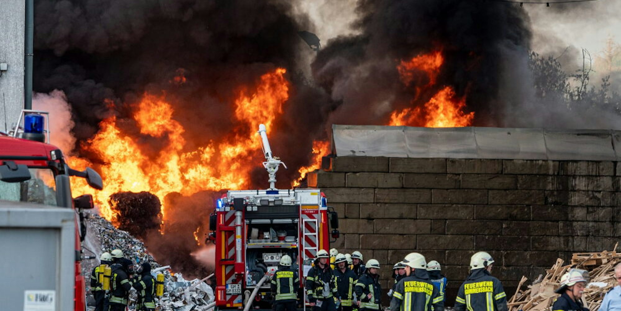 Herreshagen – Der Großbrand beim Entsorgungsbetrieb Remondis in Gummersbach-Herershagen (wir berichteten) hat die Feuerwehren bis zum Samstagmorgen beschäftigt. Gegen 18.30 Uhr am Freitagabend war das Feuer aus bislang unbekannten Gründen ausgebrochen. Rasch schlugen die Flammen bis zu 15 Meter hoch, es bildete sich eine riesige übel riechende Rauchwolke, die in Richtung Kotthausen und Marienheide davonzog.
