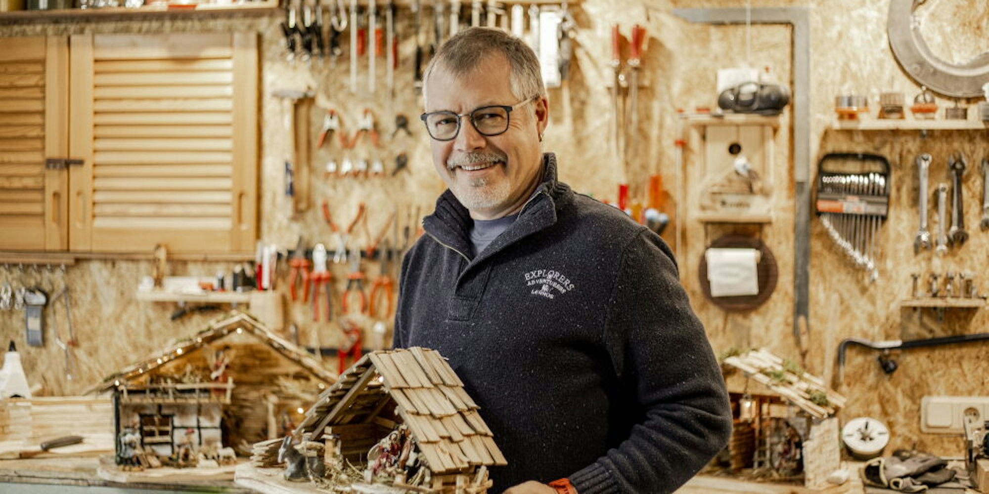 Großberndt baut schon seit 20 Jahren Krippen im alpenländischen Stil – und lässt sich auch von einer Pandemie nicht stoppen: „Man muss ja aktiv bleiben.“ Dass die Weihnachtsmärkte, auf denen er normalerweise seine Unikate ausstellt und verkauft, nicht stattfinden konnten, fand er schade. Aber es stoppte ihn nicht: „Deswegen habe ich meine Krippen in unserem Wintergarten ausgestellt.“