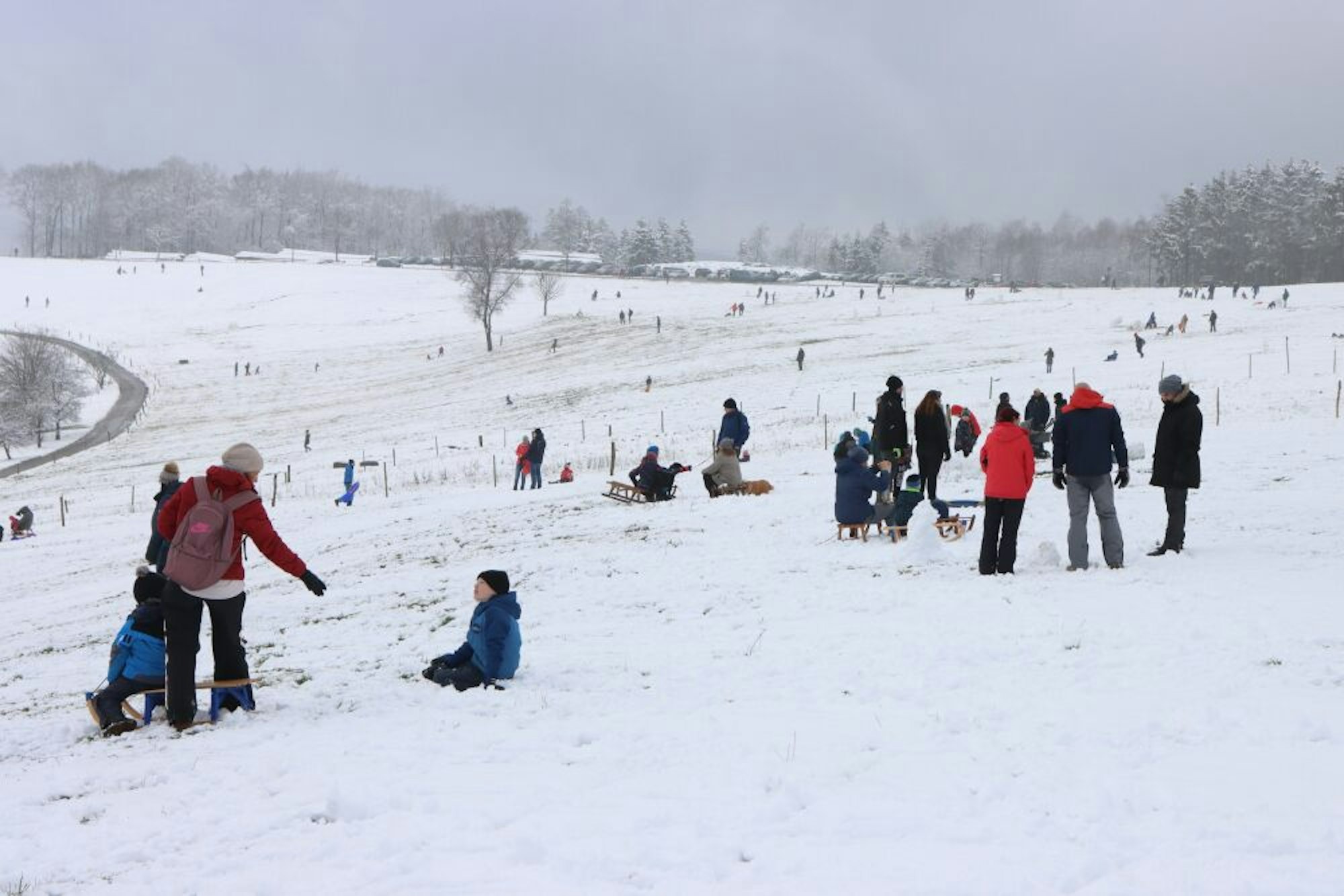 Vor allem Familien mit kleinen Kindern wollten trotz und gerade wegen der Einschränkungen die weiße Pracht zum Jahreswechsel dennoch nicht ungenutzt wegtauen lassen. Für viele war es der erste Schnee in ihrem Leben. Sie sausten mit ihren Schlitten die Hänge hinab, bauten Schneemänner oder lieferten sich Schneeballschlachten. Daniel Brauer aus Denklingen war mit seinen Kindern Aurelia (3) und Florian (4) eigentlich zum Schlittenfahren gekommen. Doch beiden gefiel es dann doch besser, eine Schneekugel zu rollen und darauf herumzuhüpfen. Marko und Kerstin Schmitz waren schon am Silvesternachmittag aus Wahlscheid gekommen. „Bei uns hat es nur geregnet“, erzählten sie. „Wegen Corona müssen wir bei unseren Kindern für gute Laune sorgen.“ Die sechsjährige Elli und ihr dreijähriger Bruder Paul bauten einen großen Schneemann. Elli taufte ihn auf den Namen „Kalli“, bevor sie sich auf den Schlitten schwang. Sie war ganz begeistert und fragt: „Können wir morgen noch mal kommen? Hier ist es richtig cool!“