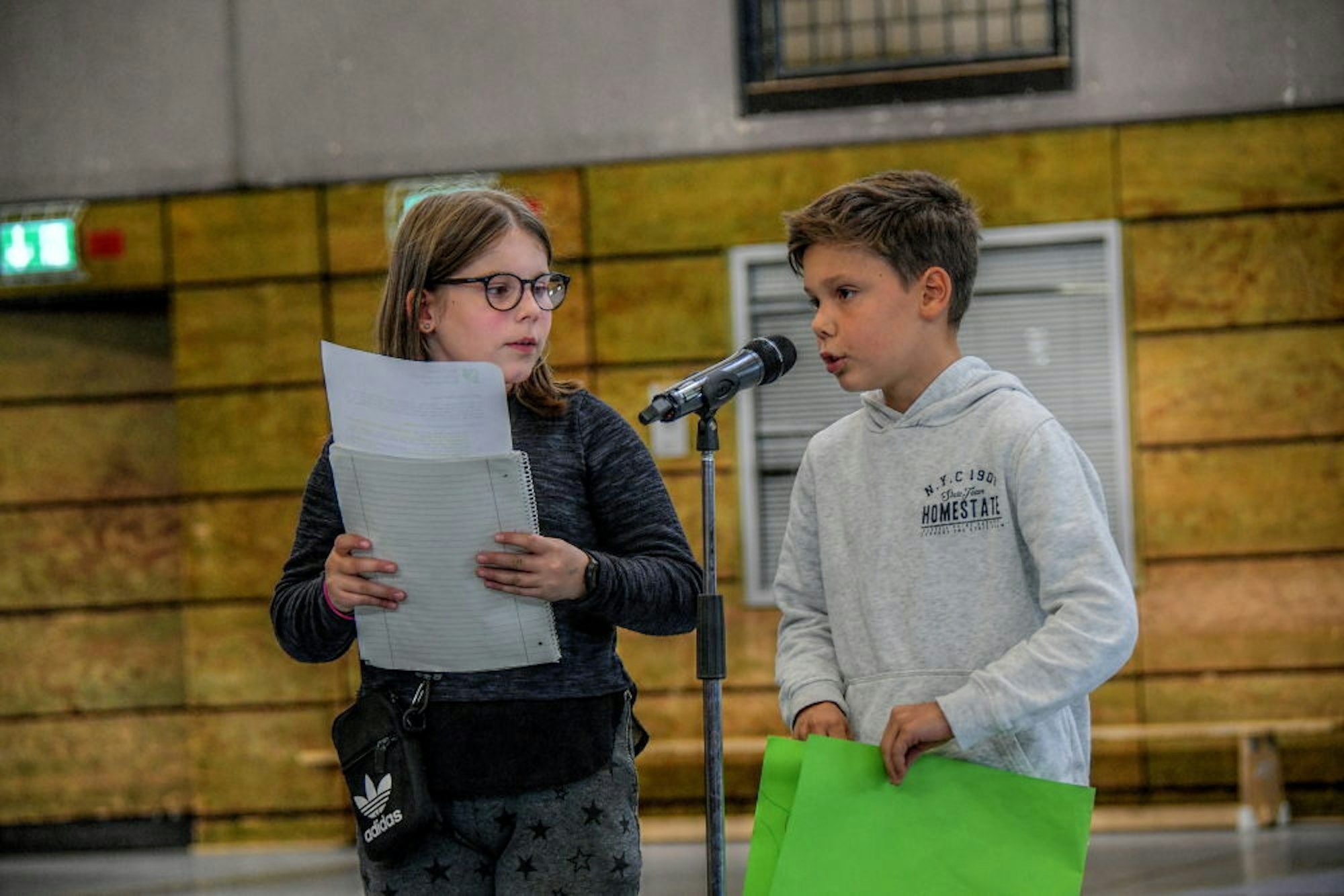 Nach erst drei Wochen in der Schule sprachen die Fünftklässler Marty und Jamilia Leonie (beide 10 Jahre alt) vor mehr als 1000 Mitschülern, Lehrern und Gästen. Kurz und knapp berichteten sie, mit ihrer Lehrerin Annett Beinling „Das Märchen vom Glück“ von Erich Kästner durchgearbeitet zu haben.