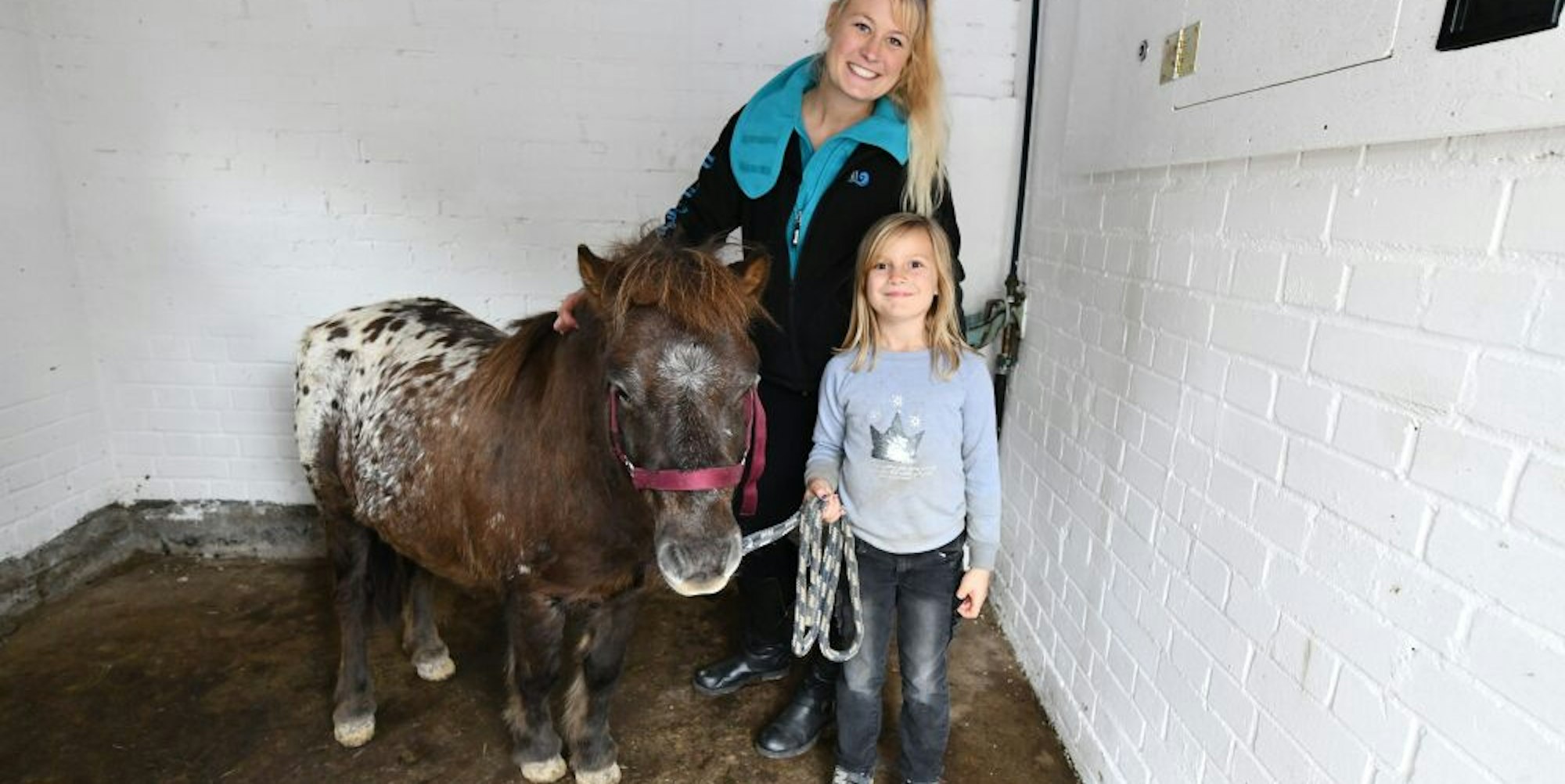 Anika Hunold behandelt mit Emily Pütz Pony Findus in der Solekammer.