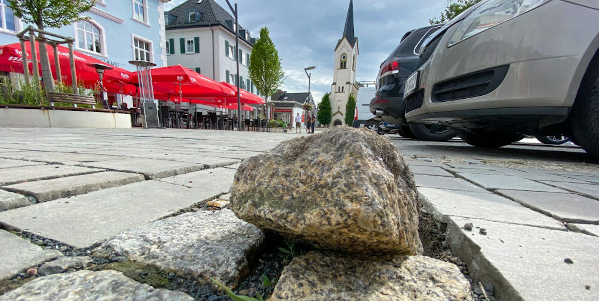 Offenbar hielten die Steine den Scherkräften nicht stand, die in einer Ein- und Ausfahrt entstehen, und die nun gegen schnöden Asphalt ausgetauscht werden sollen. Jetzt bröckelt die Einfassung der Parkplatzmarkierung, just zu einem Zeitpunkt, an dem die provisorische Toilette rüber zum Rathaus gehoben werden muss, weil auf dem Markt kein Anschluss für den Schmutzwasserkanal liegt. (lb)