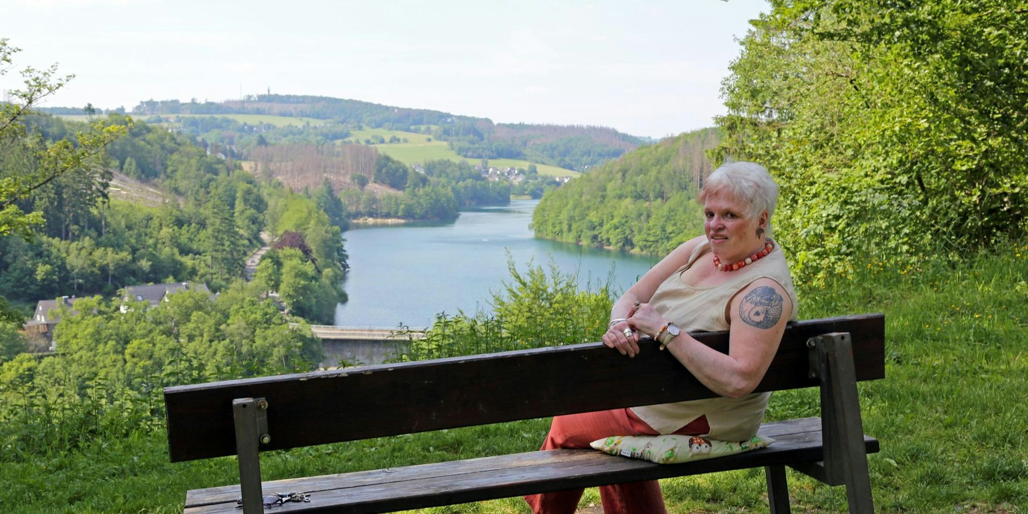 Noch vor dem Frühstück sitzt Martina Deckarm gern auf der Bank hoch über der Talsperre.