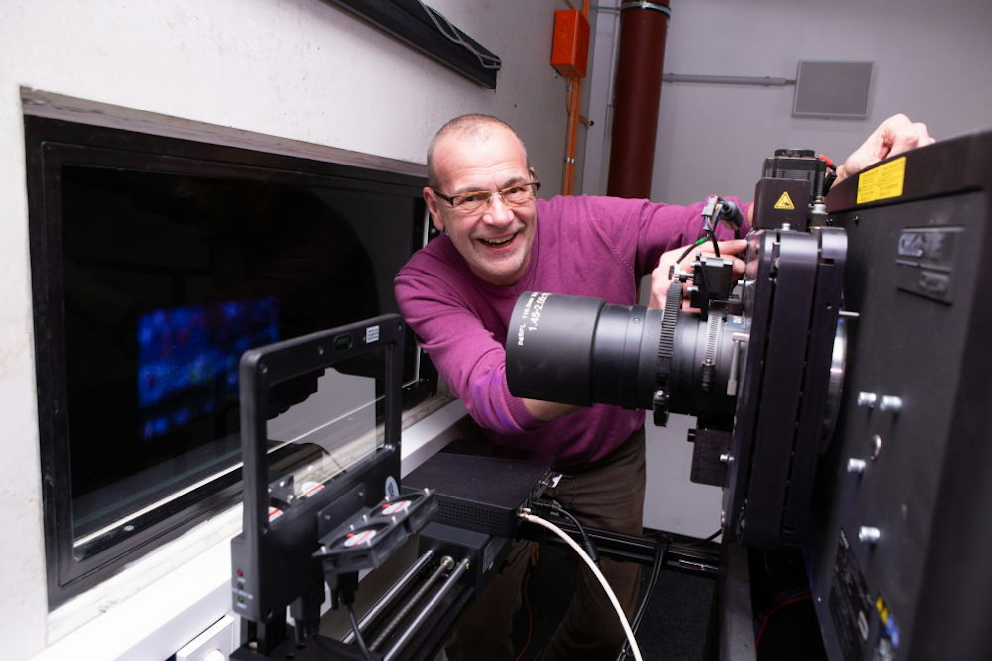 Schon beim Bau wurde das Seven darauf ausgelegt, auch Fernsehbilder auf die Leinwand zu bringen. Technik-Manager Arnulf Pickert kümmert sich in der Nacht darum, dass die Übertragung glatt läuft. Die Satellitenschüssel auf dem Dach hat er mit einem leistungsstarken Receiver und den wiederum mit dem hochauflösenden Kinoprojektor verbunden. Um 22.23 Uhr überprüft er noch mal die Anschlüsse im Vorführraum hinter dem Saal. Das Bild steht. Derweil bereitet sein Kollege Mayo Balaban an der Snack-Theke alles vor. Er schiebt gemeinsam mit zwei Kollegen in dieser Nacht eine Extra-Schicht – und hat dafür etwas vorgeschlafen.