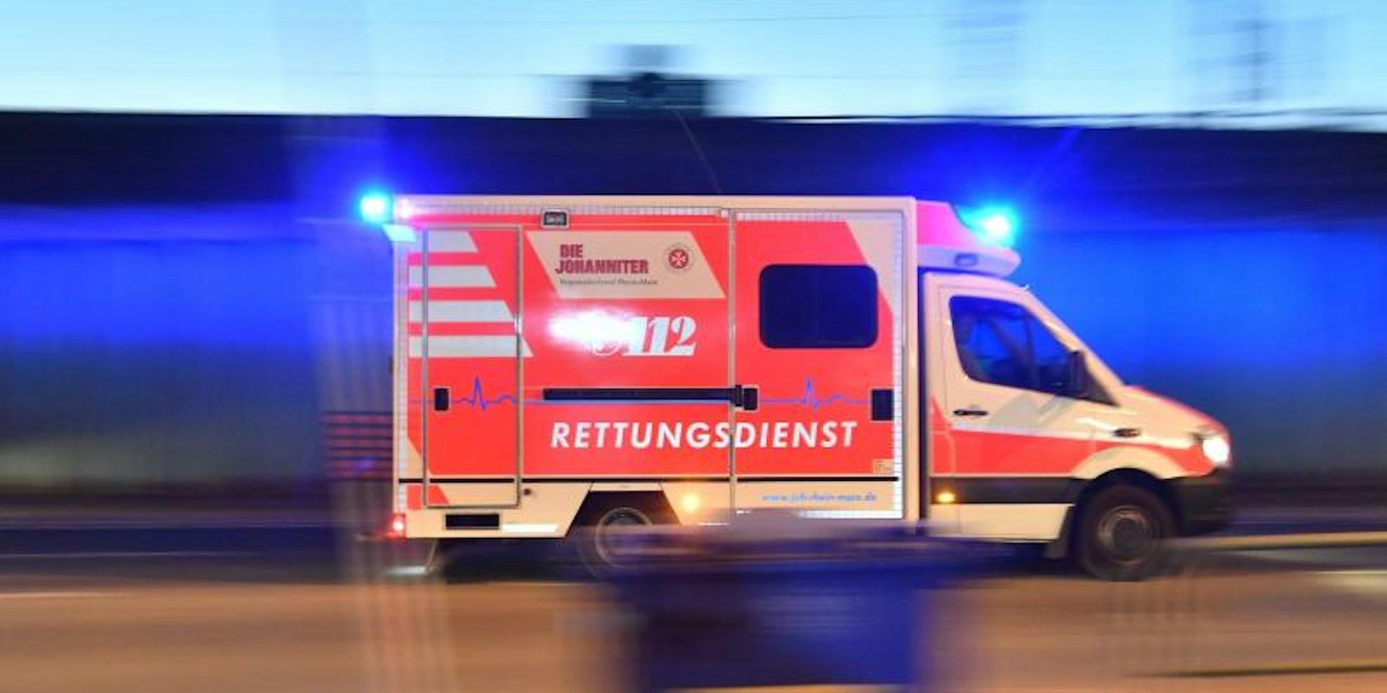 Ein Rettungswagen ist mit eingeschaltetem Blauchlicht im Einsatz.