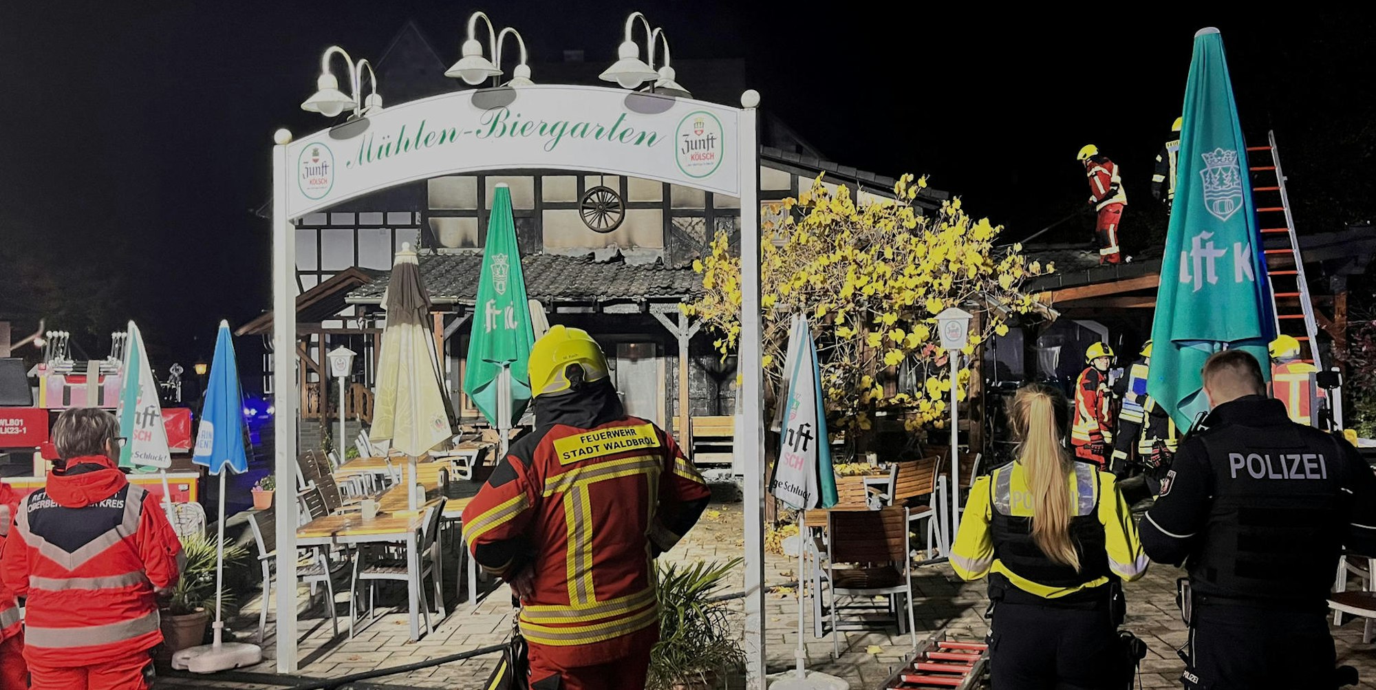 Waldbröl – Nach einem Feuer im Biergarten des Hotels und Restaurants „Haus am Mühlenberg“ an der Vierbuchermühle mussten am frühen Sonntagmorgen 29 Personen evakuiert werden. Der Rettungsdienst untersuchte die Menschen vor Ort, verletzt wurde laut Feuerwehr aber niemand.