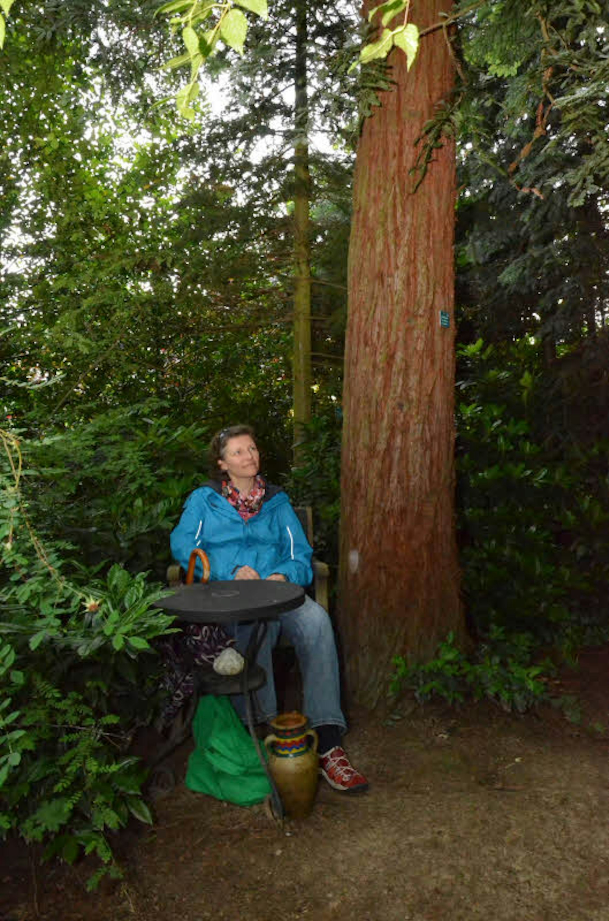 Besucherin Sabine Fröhlich aus Lindlar sitzt trotz starken Regens im Trockenen: So dicht gewachsen ist der Forstbotanische Garten des Ehepaares Scheplitz in Waldbröl.