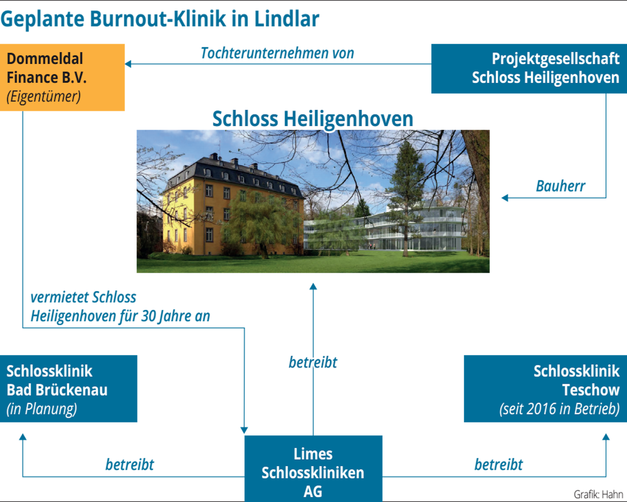 Schloss Heiligenhoven in Lindlar soll zu einer Spezialklinik für die Behandlung von Patienten mit Angst- und Erschöpfungszuständen, Schlafstörungen, Depressionen und Burnout umgebaut werden. Die Klinik mit 120 Betten ist ausgelegt für Patienten mit privater Krankenversicherung, für Patienten mit einer privaten Zusatzversicherung und für Selbstzahler. Vergleichbare Kliniken kalkulieren mit einem Tagessatz von rund 500 Euro.