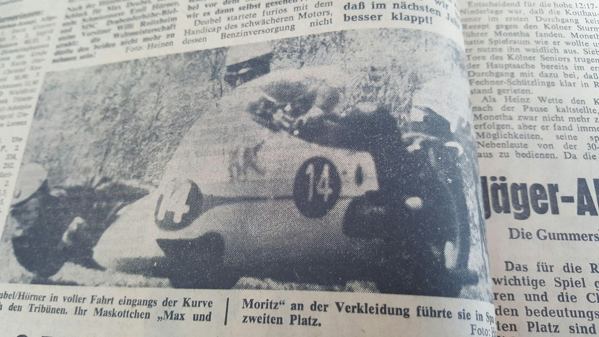 Dabei war Deubel vor dem Start in Spa ein wenig skeptisch wie die Berichte in dieser Zeitung wiedergeben. Der spätere Vize-Weltmeister Fritz Scheidegger und sein Gespannmann Horst Burkhardt waren im Training einige Kilometer schneller und der Rechtskurs kam dem Linksseitenwagen des Schweizers entgegen.