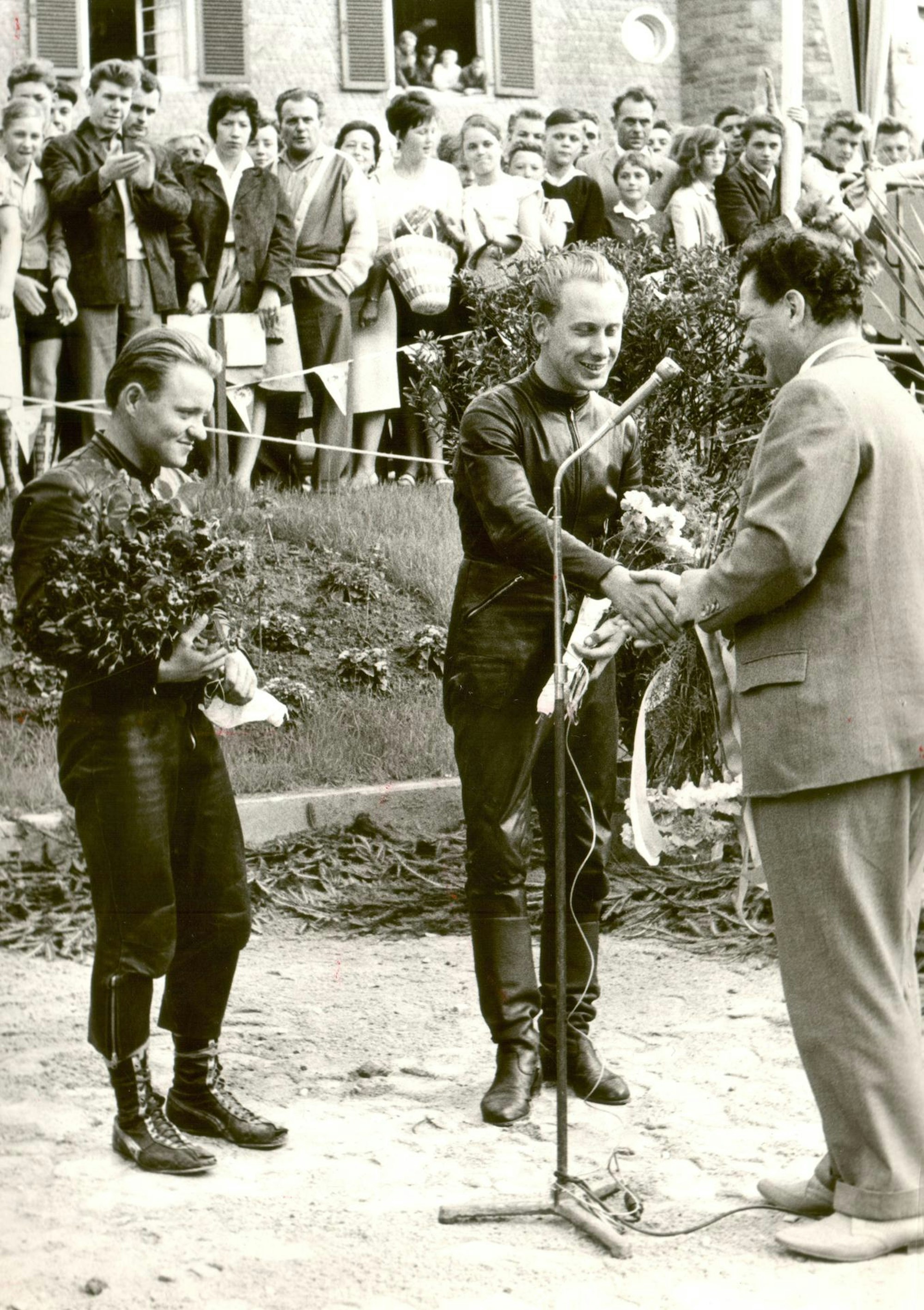 Seitenwagen-Weltmeister Max Deubel (Mi.) und Emil Hörner (li.) werden nach dem Sieg in Bielstein empfangen.