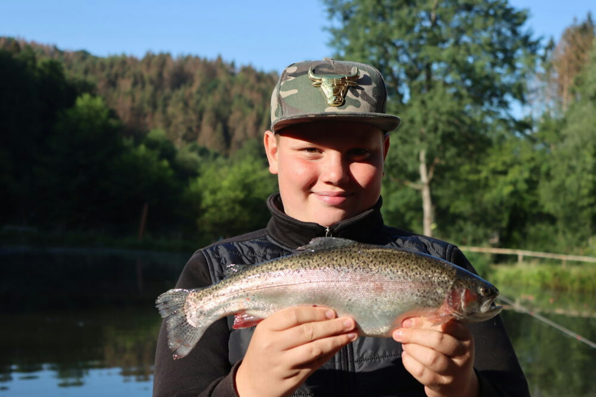 Niklas freut sich über eine schöne Forelle.