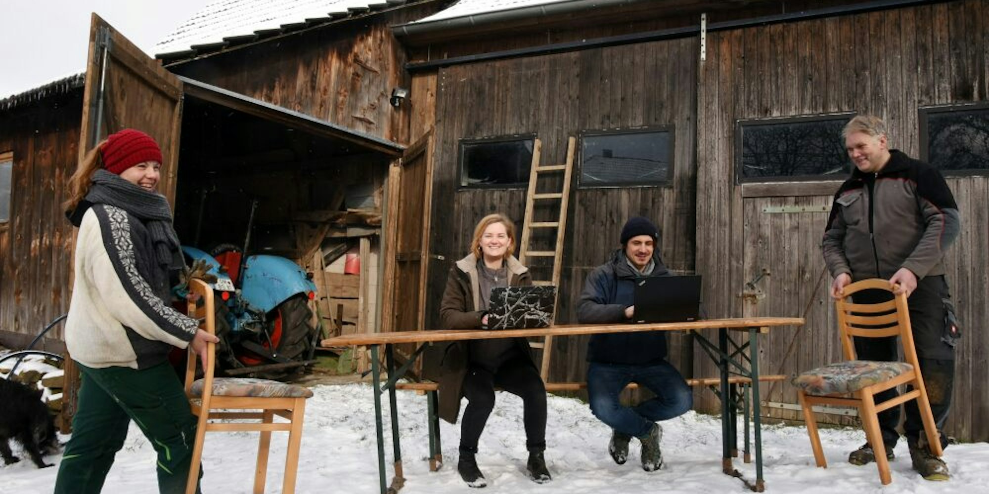 Mit dem Laptop vor dem Stall. Noch ist der Arbeitsplatz auf dem Gut Kremershof improvisiert, doch das soll sich nach Willen von Rahel Kremershof, Mona Beckmanns, Lucas Danischund Thorsten Kremershof (von links) bald ändern.