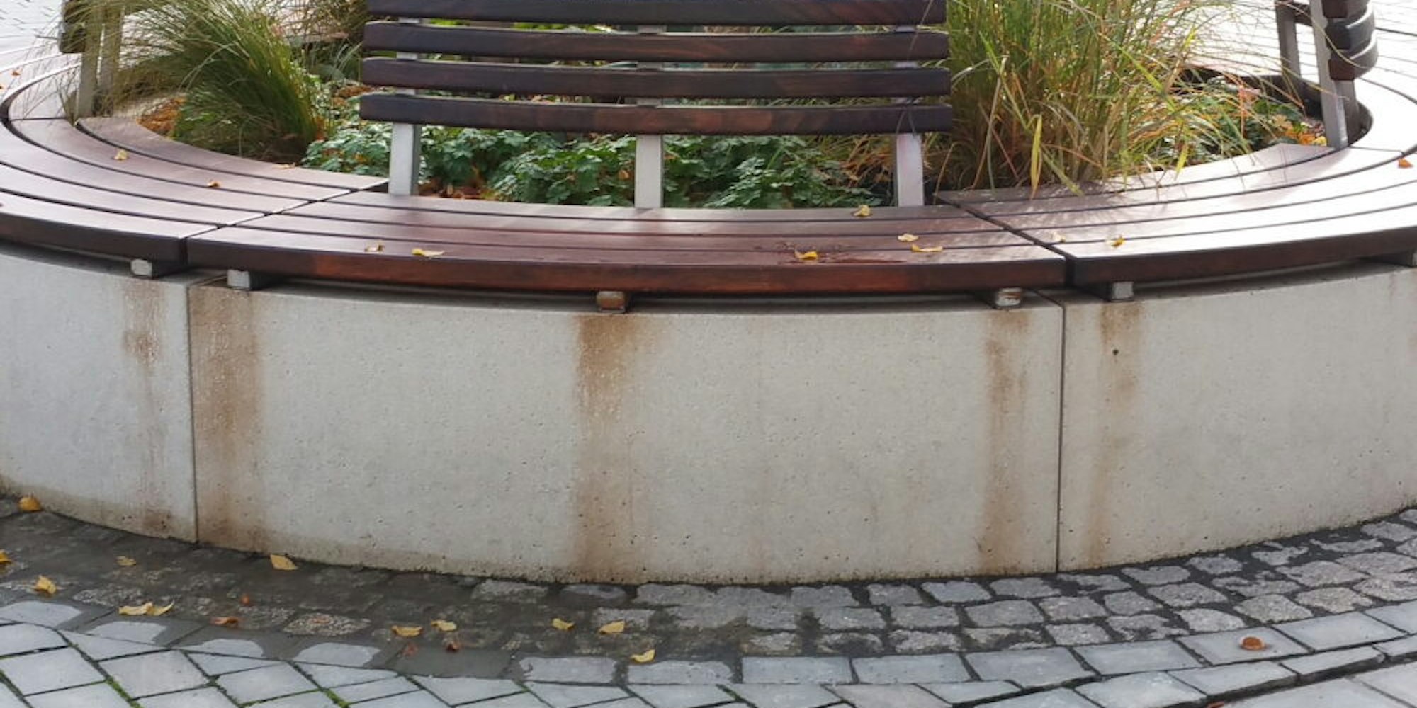 Die Firma montierte die Bänke wieder ab, reinigte aufwendig den Beton und setzte das Holz über den Winter der Witterung aus, damit die Gerbstoffe ausgespült wurden. Doch wie jetzt offensichtlich ist, hat das wohl nicht ausgereicht und es sind immer noch Gerbstoffe vorhanden, die bei längeren Regenperioden austreten.