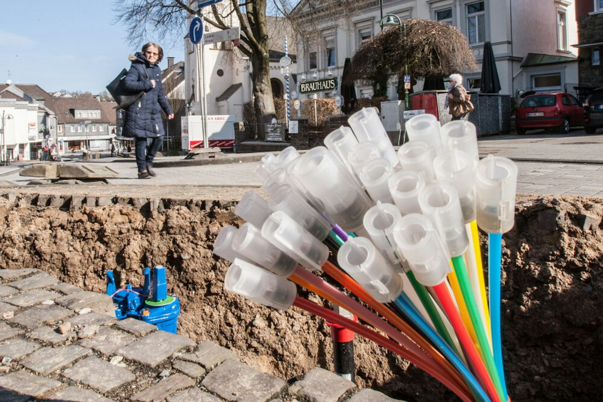 Bis Ende dieses Jahres will der Energieversorger 2000 Haushalte an das Glasfasernetz angeschlossen haben, auf Hückeswagener Seite kommen weitere 1000 Häuser hinzu. „Aktuell fehlen noch kleine Verbindungsstücke“, berichtet BEW-Sprecherin Sonja Gerrath. Die bekannteste Baustelle befindet sich derzeit im Kreuzungsbereich von Ring-, Gaul-, und Ostlandstraße. Hier werden die Internetanschlüsse für das Bergische Berufskolleg und die Antoniusschule montiert. Um Staus möglichst zu vermeiden, hat die BEW die Querung der Gaulstraße in Höhe der Einfahrt zum Amtsgericht für das Wochenende 10. und 11. April angesetzt.