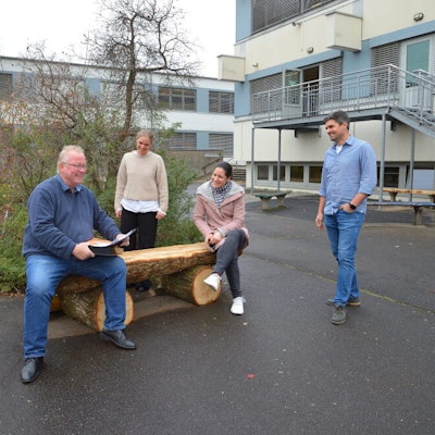 Auf dem Dach der Krankenpflegeschule am Evangelischen Krankenhaus: (v.l.) Die Pflegeschüler Jasmin Boujatouy, Mascha Wolf, und Fabian Faßbender mit Praxisanleiterin Nina Kaballa.