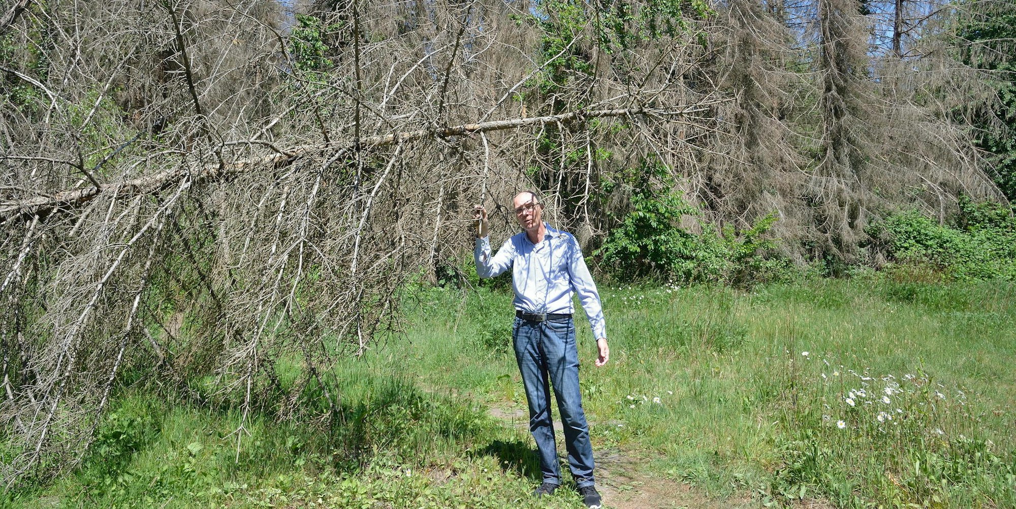 - Dierk Lürbke bereiten die trockenen Fichten auf seinem benachbarten Waldgrundstück Sorgen.