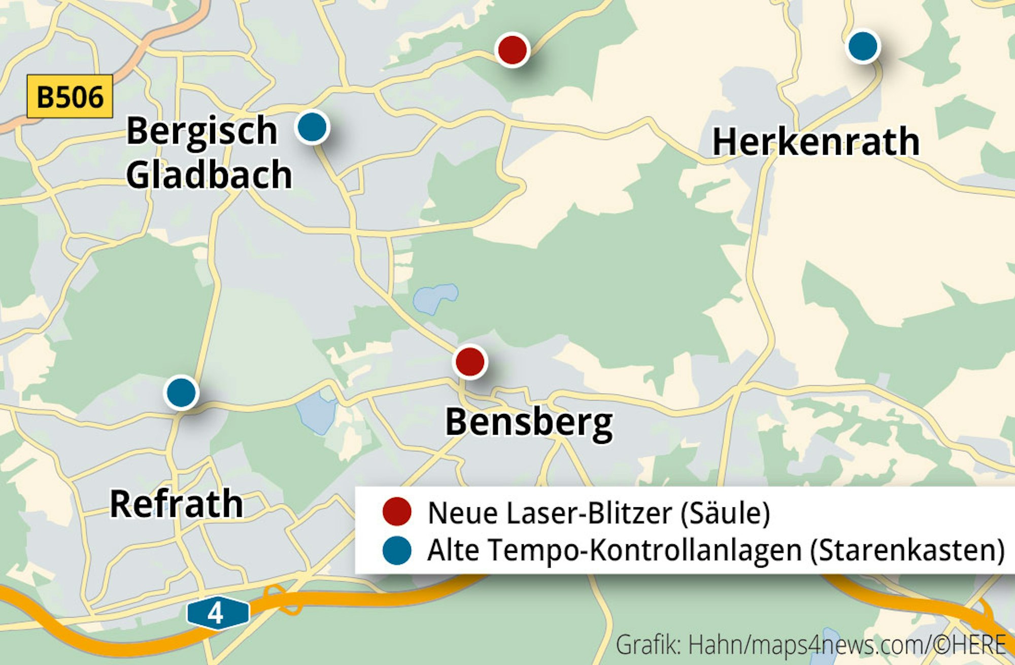 Mit dem Ausfall der Anlage nahe Herkenrath ist die Zahl der städtischen Überwachungssysteme vorübergehend auf vier geschrumpft: an der Gladbacher Straße, an der Kürtener Straße, an der Dolmanstraße in Refrath und an der Bensberger Straße, unmittelbar vor dem Turbokreisel Schnabelsmühle in der Stadtmitte.