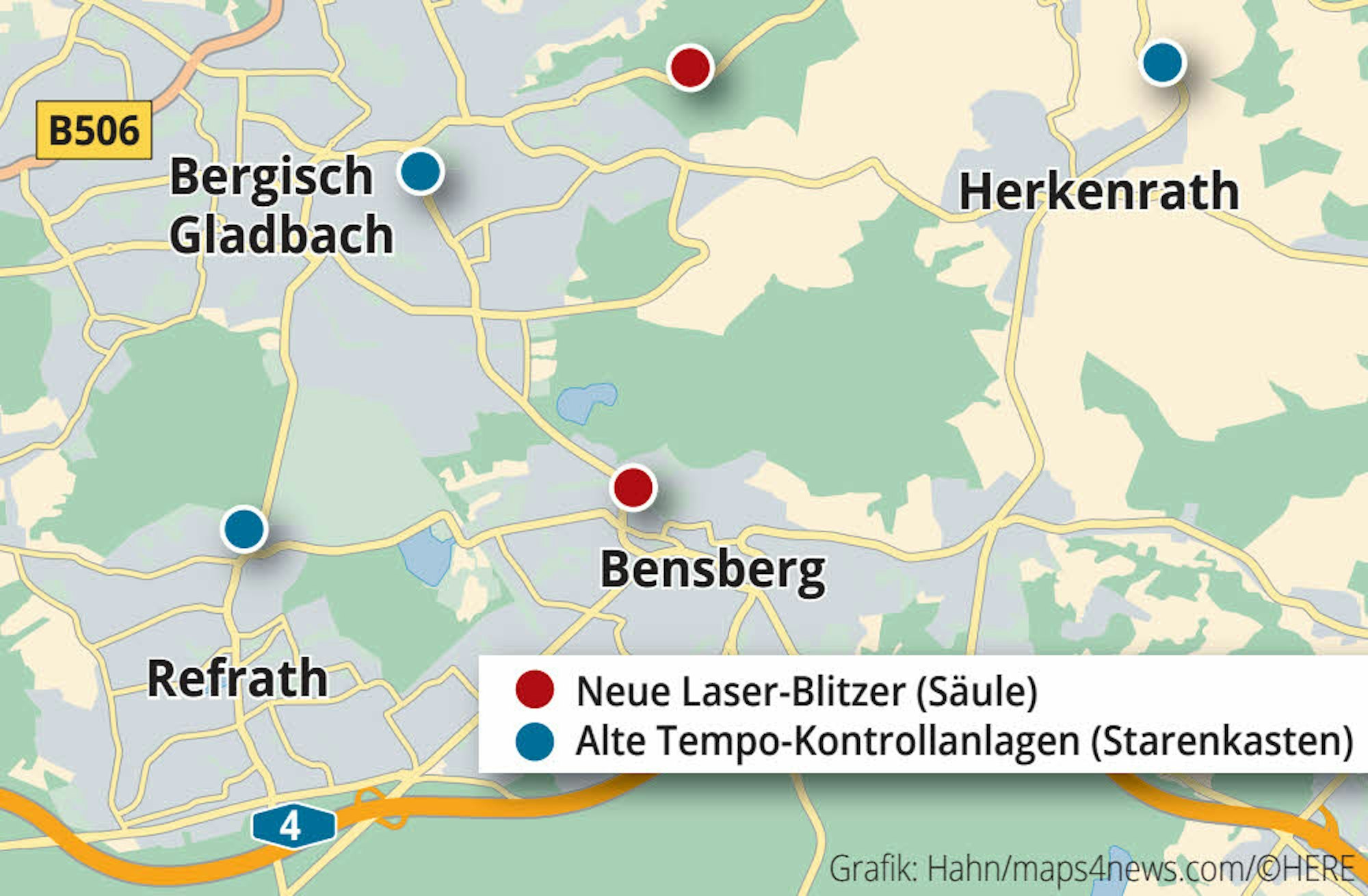An den übrigen drei Standorten (Dolmanstraße/Ortseingang Alt-Refrath, Braunsberg/ Ortsausgang Herkenrath, Schnabelsmühle/Stadtmitte) bleiben die bisherigen „Starenkästen“ erhalten, die Tempoverstöße mit Induktionsschleifen in der Fahrbahn erfassen, in Betrieb (blaue Punkte).
