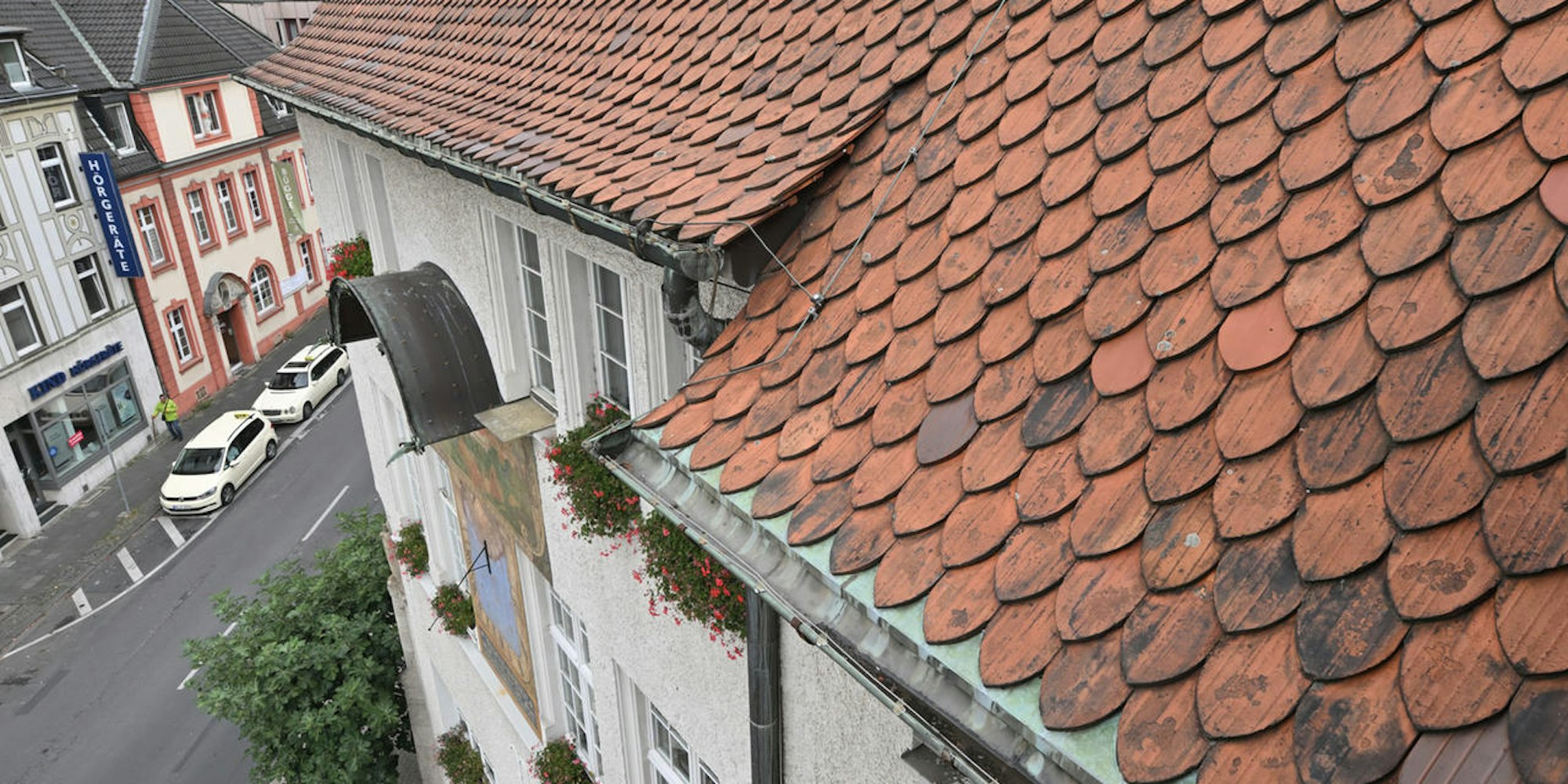 Die Regenrinnen am Rathaus werden mit elektrischen Drähten vor Tauben geschützt.