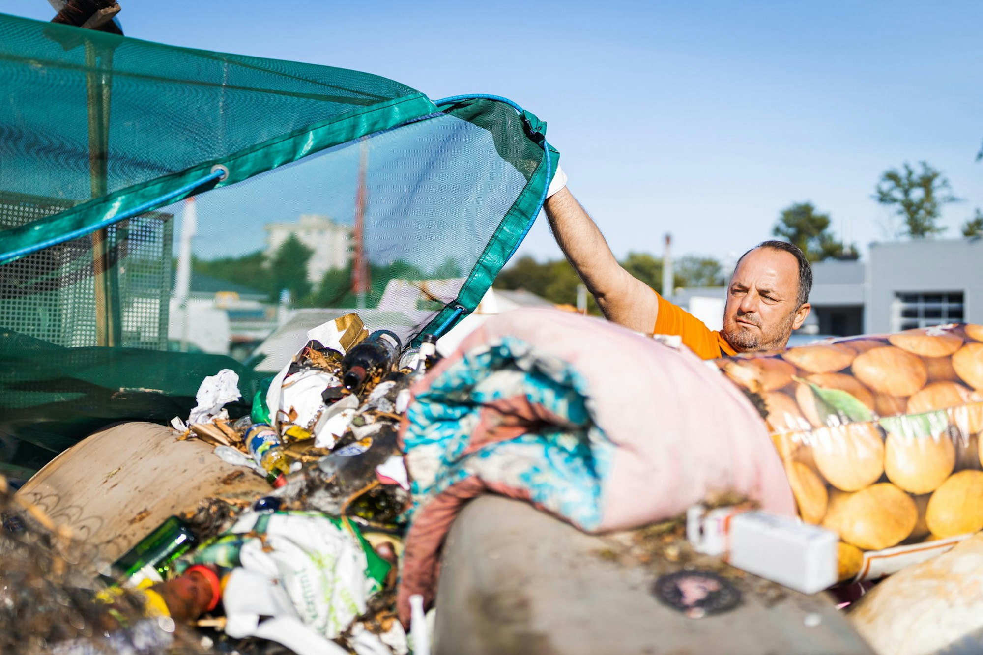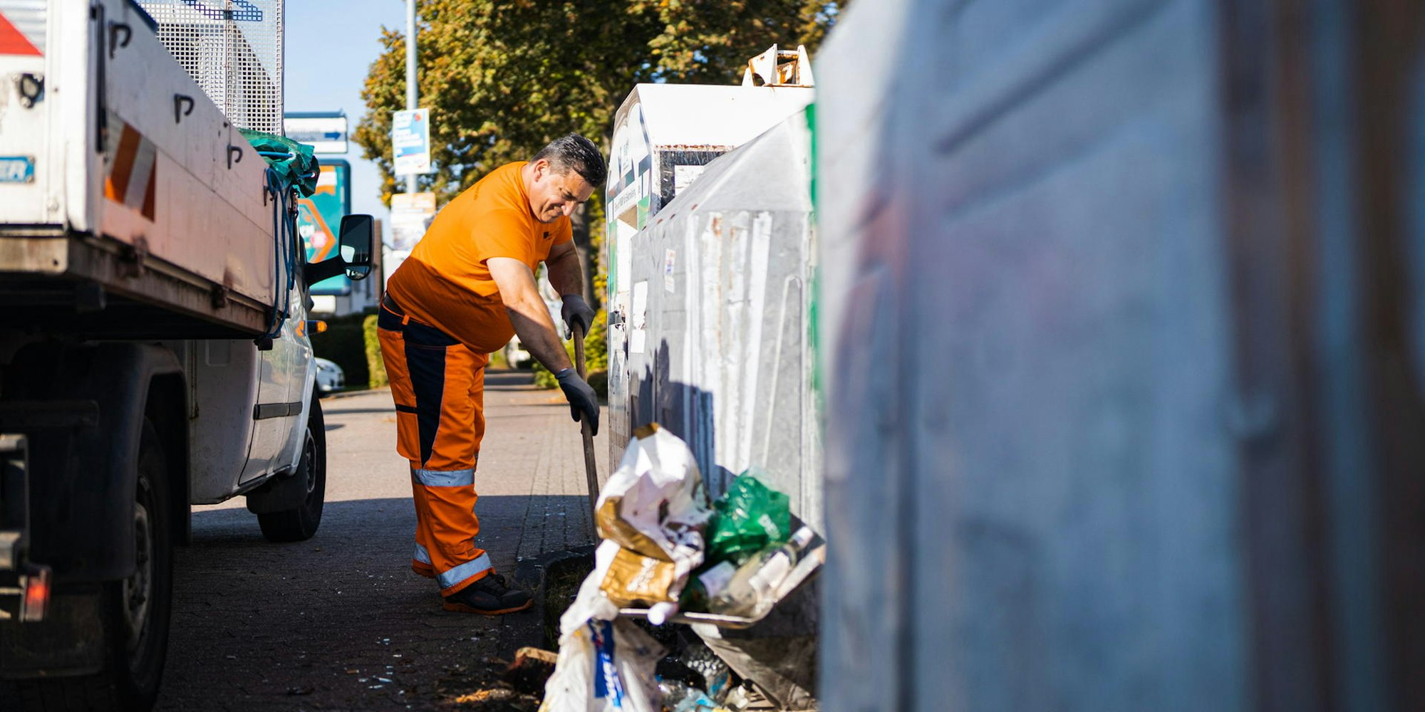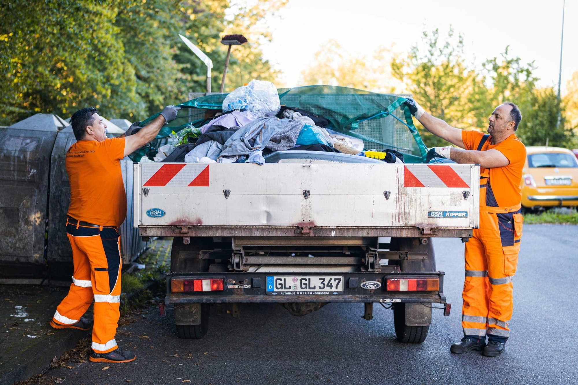 Müllwerker bei ihrer täglichen harten Arbeit. 160 Tonnen illegaler Müll lagen in 2019 allein an Containerstandorten. David Zenz und Frank Stein präsentierten die Sauberkeitskampagne.