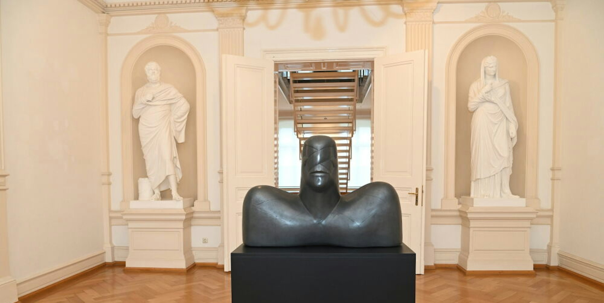 Bergisch Gladbach – Oben am Treppenaufgang empfängt der schwarze „Wächter“ den Besucher der Ausstellung mit Arbeiten von Hede Bühl im Kunstmuseum Villa Zanders. Ganz nah kommt die martialische Polyesterfigur dem Betrachter – näher als in der realen Ausstellung „Imago“ erlaubt. Denn beim virtuellen Rundgang, der auf der Homepage des Museums zu finden ist, können Kunstfreunde dem Wächter mit der Lupe zu Leibe rücken. Sie werden Details entdecken. Die feinen Linien auf den straffen Augenbinden, die zarte Zeichnung der Lippen. Ein blinder Koloss, in sich gekehrt und doch fast demonstrativ nach vorn blickend, verletzlich, aber auch wehrhaft.