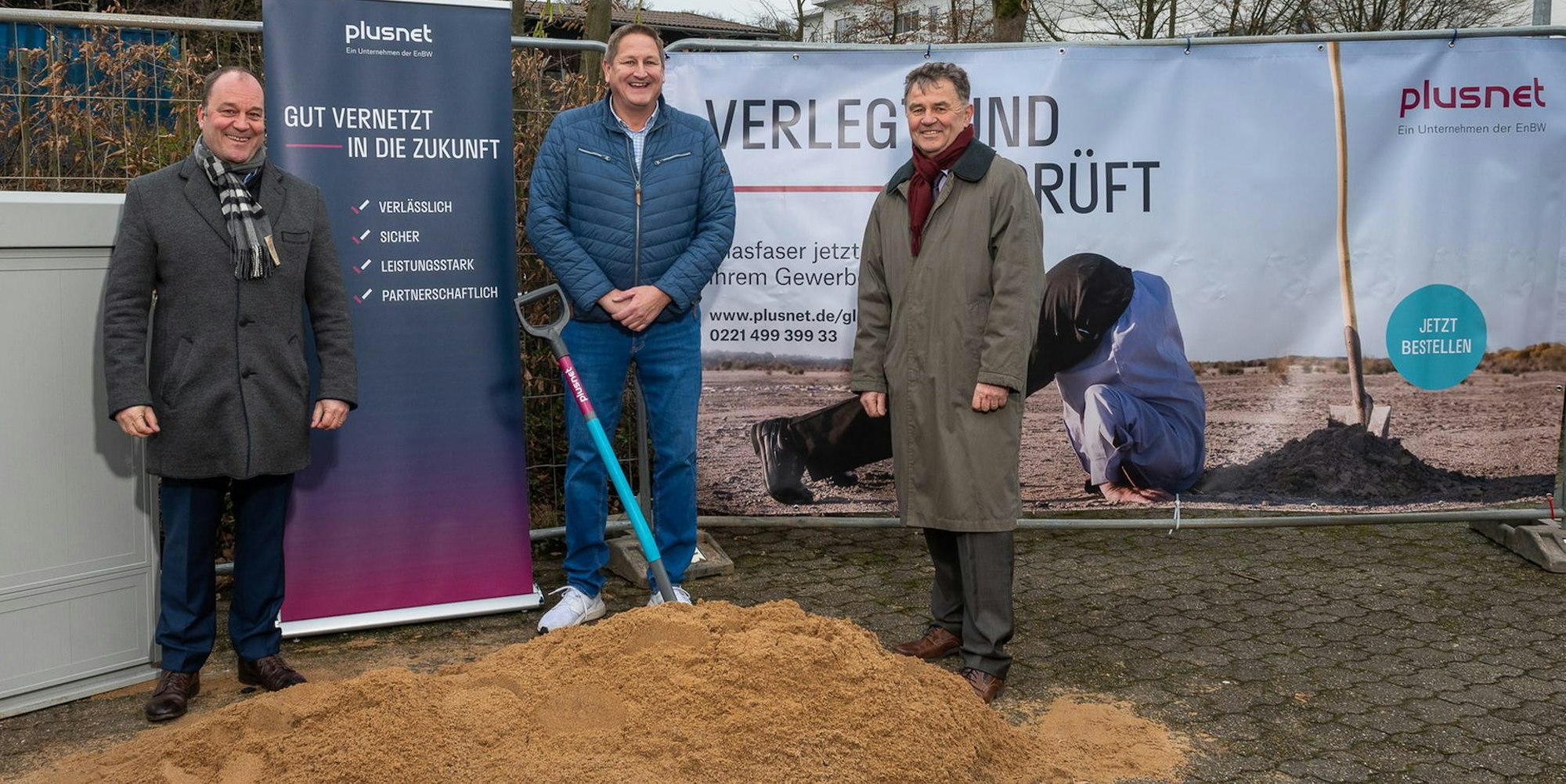 Die Vertreter der Firma Plusnet beim Spatenstich.