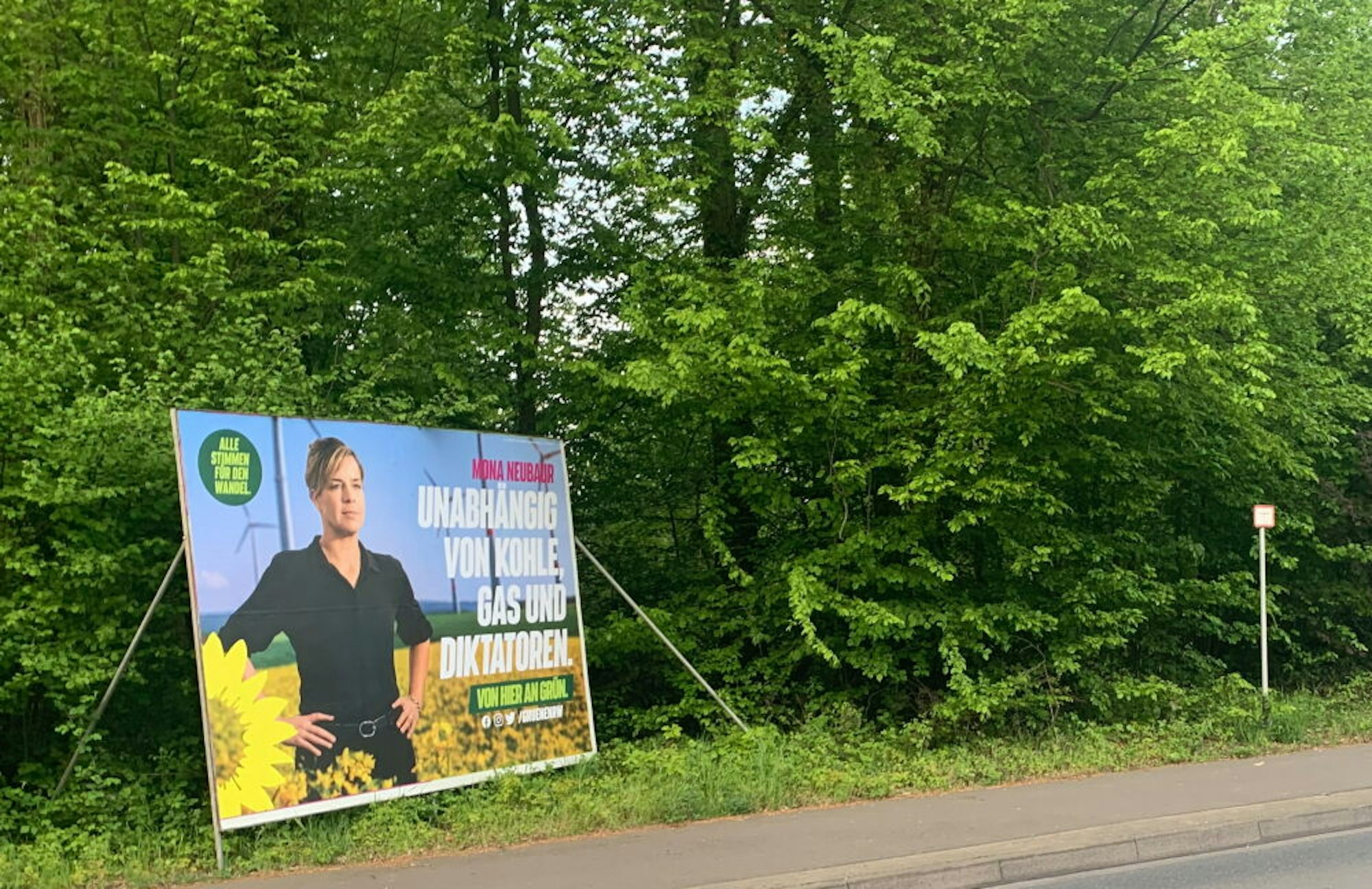 Im Naturschutzgebiet der Grube Cox bei Bergisch Gladbach-Lückerath steht dieses Wahlplakat von Bündnis 90/Die Grünen.
