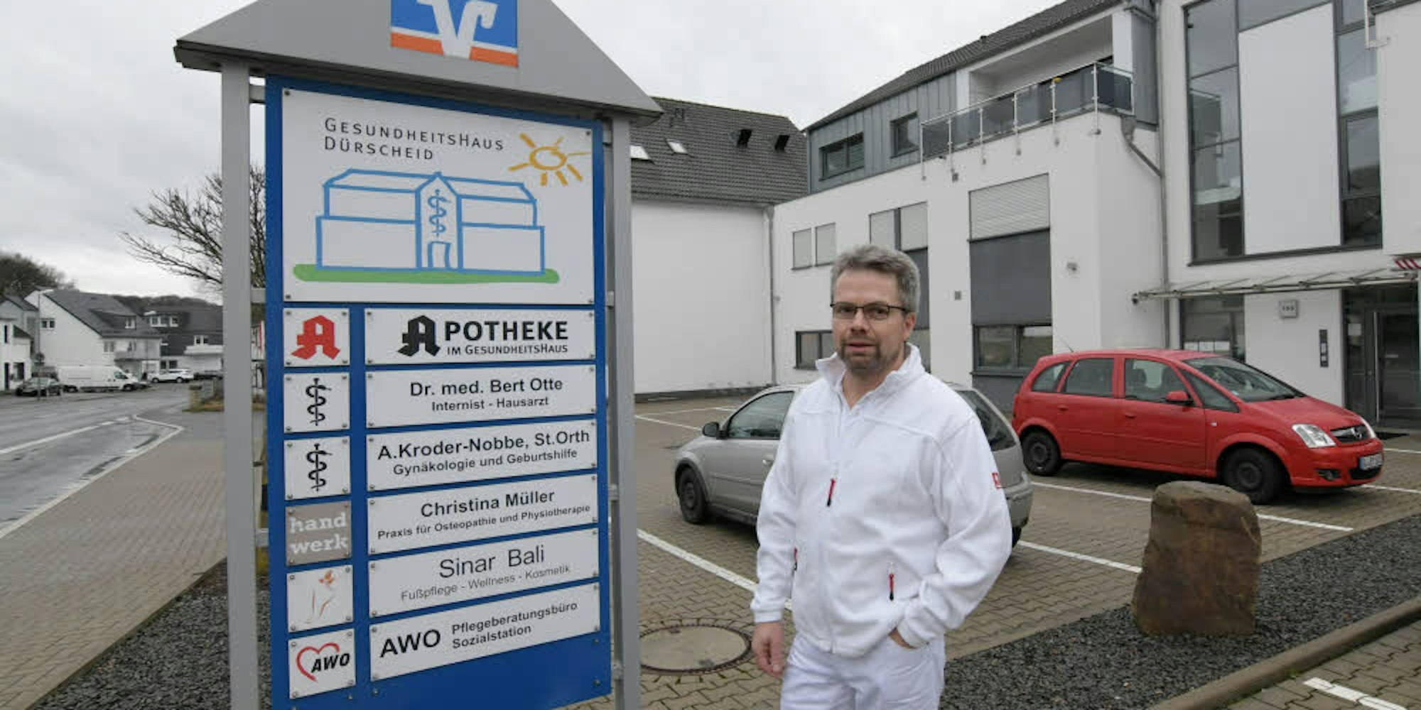Bert Otte hat seine Praxis im Dürscheider „Gesundheitshaus“. Wie er fürchten auch die anderen Mieter, dass das benachbarte Bauprojekt Fremdparker anziehen könnte.