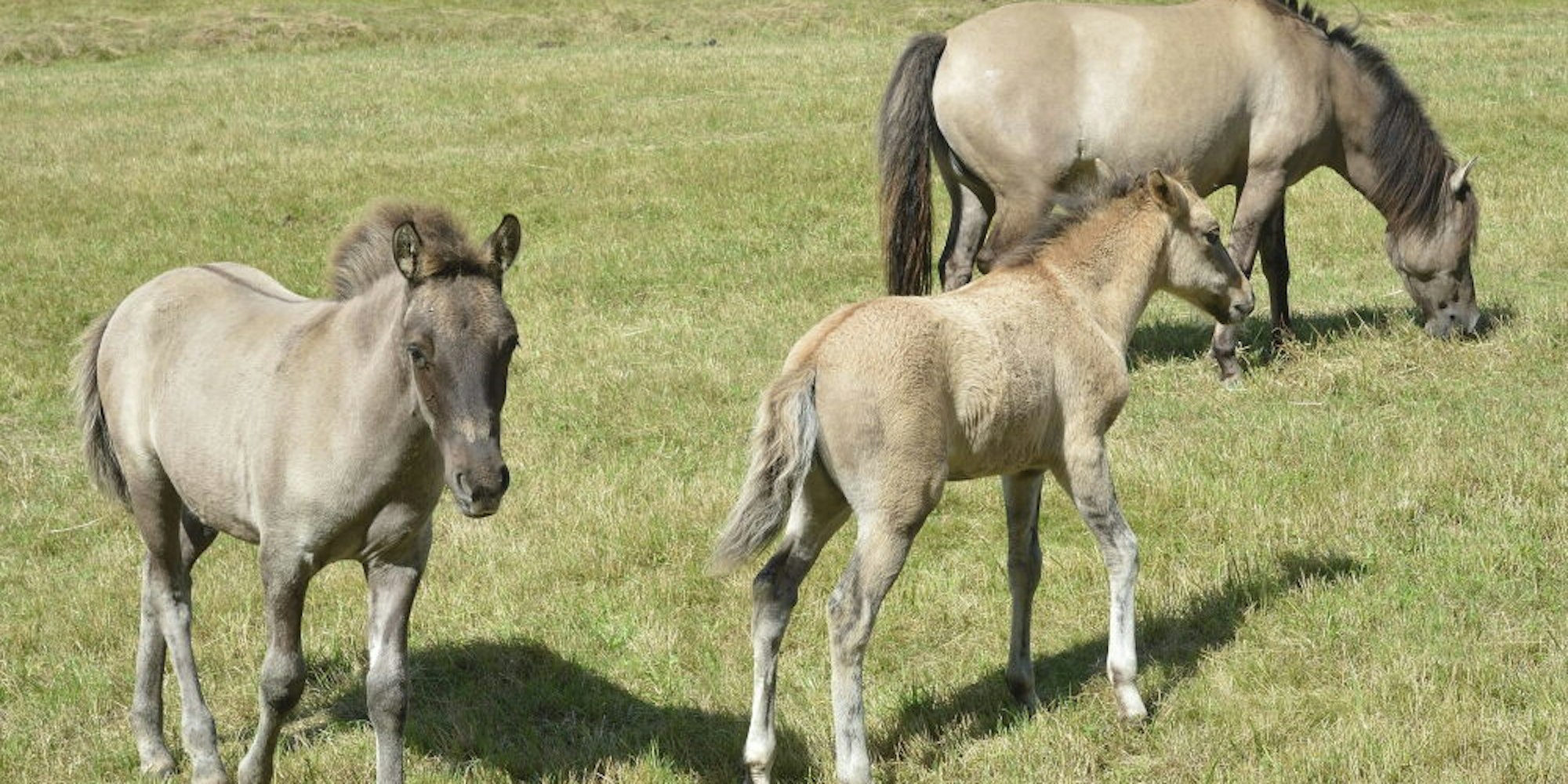Drei Dülmener Fohlen im Sonnenschein: Gretel, Fine und Karl sind erst wenige Wochen alt.